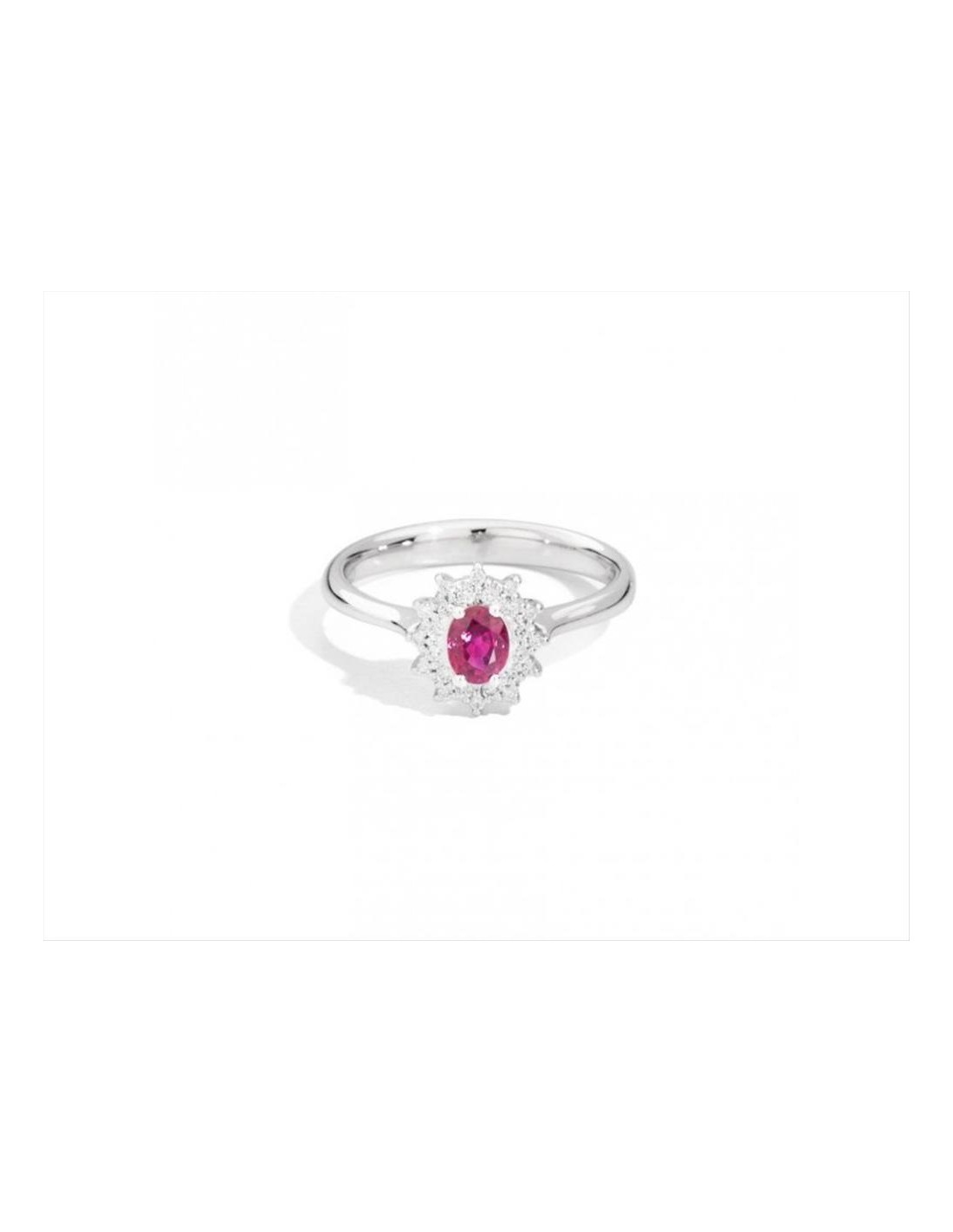 Anello Recarlo, in oro bianco 18KT, con rubino ovale centrale ct. 0,45 e contorno di diamanti ct. 0,13 ,col.F ,pur. VS, peso oro gr. 3,66 Misura 13