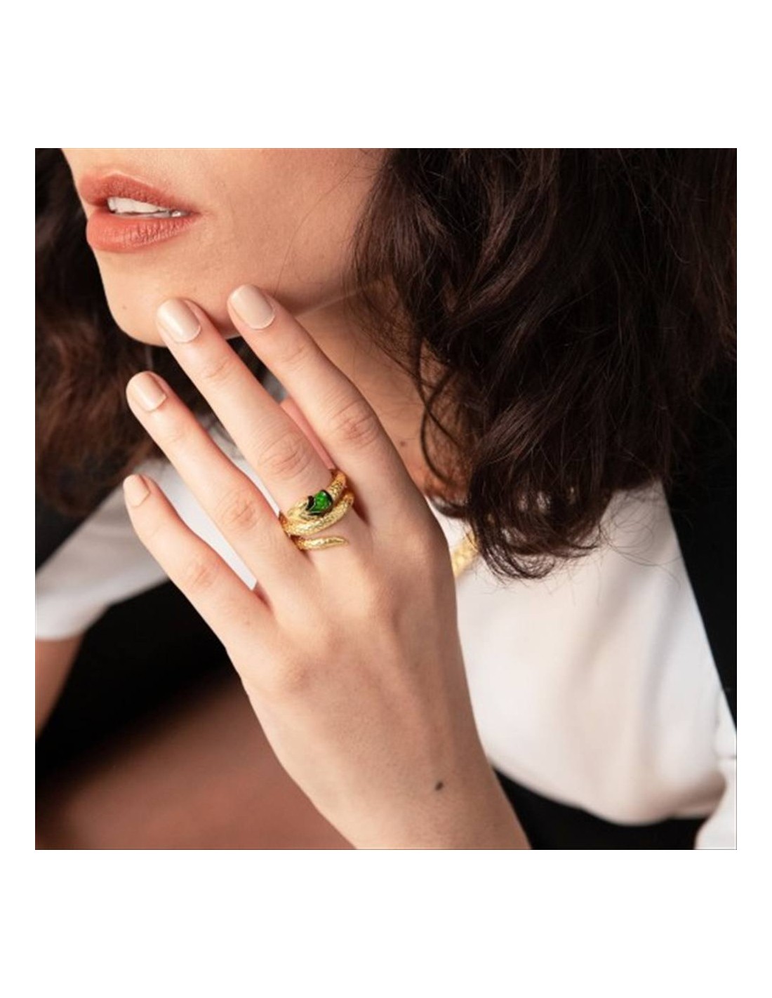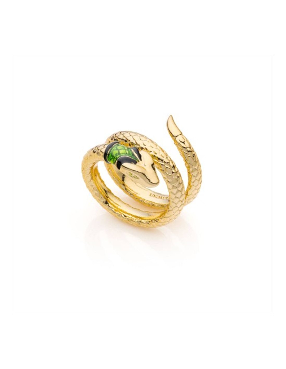 Anello Unoaerre, in bronzo dorato a spirale con testa di serpente e finitura in smalto verde. Scaglie lucenti e texture preziosa, Unoaerre interpreta con grande capacità plastica il tema stilistico animalier in un anello seducente e figurativo che avvolge con sensualità ed eleganza estrema le dita.