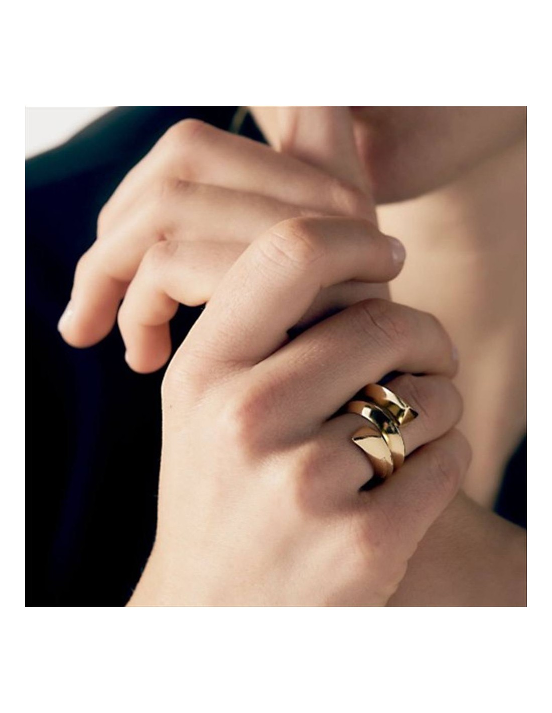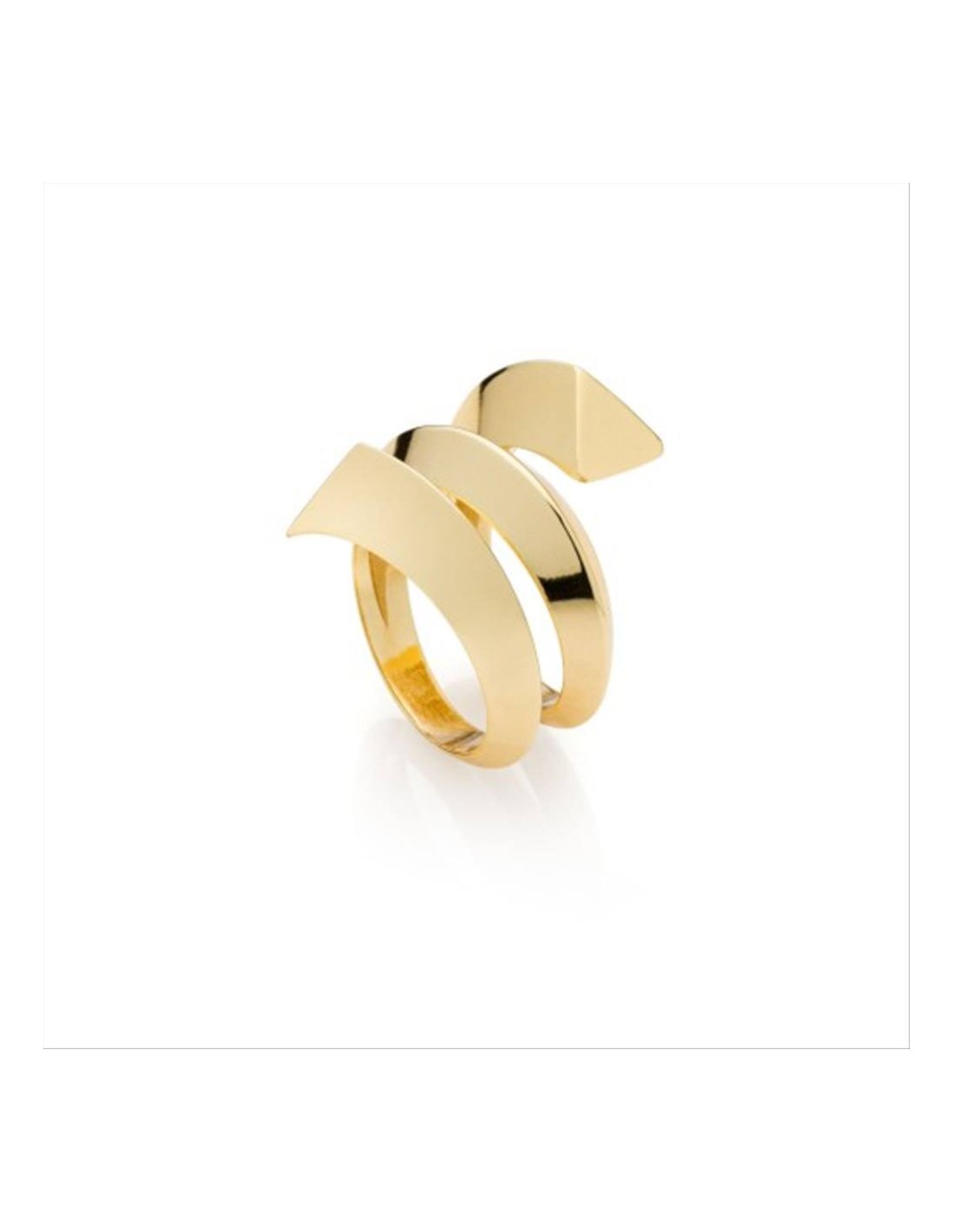 Anello Unoaerre Triangoli, in bronzo dorato, modello aperto a tre giri contrariè con tubo triangolare e bagno in oro. UNOAERRE riconsidera il concetto stesso di gioiello con un design di geometrie essenziali e dettagli audaci