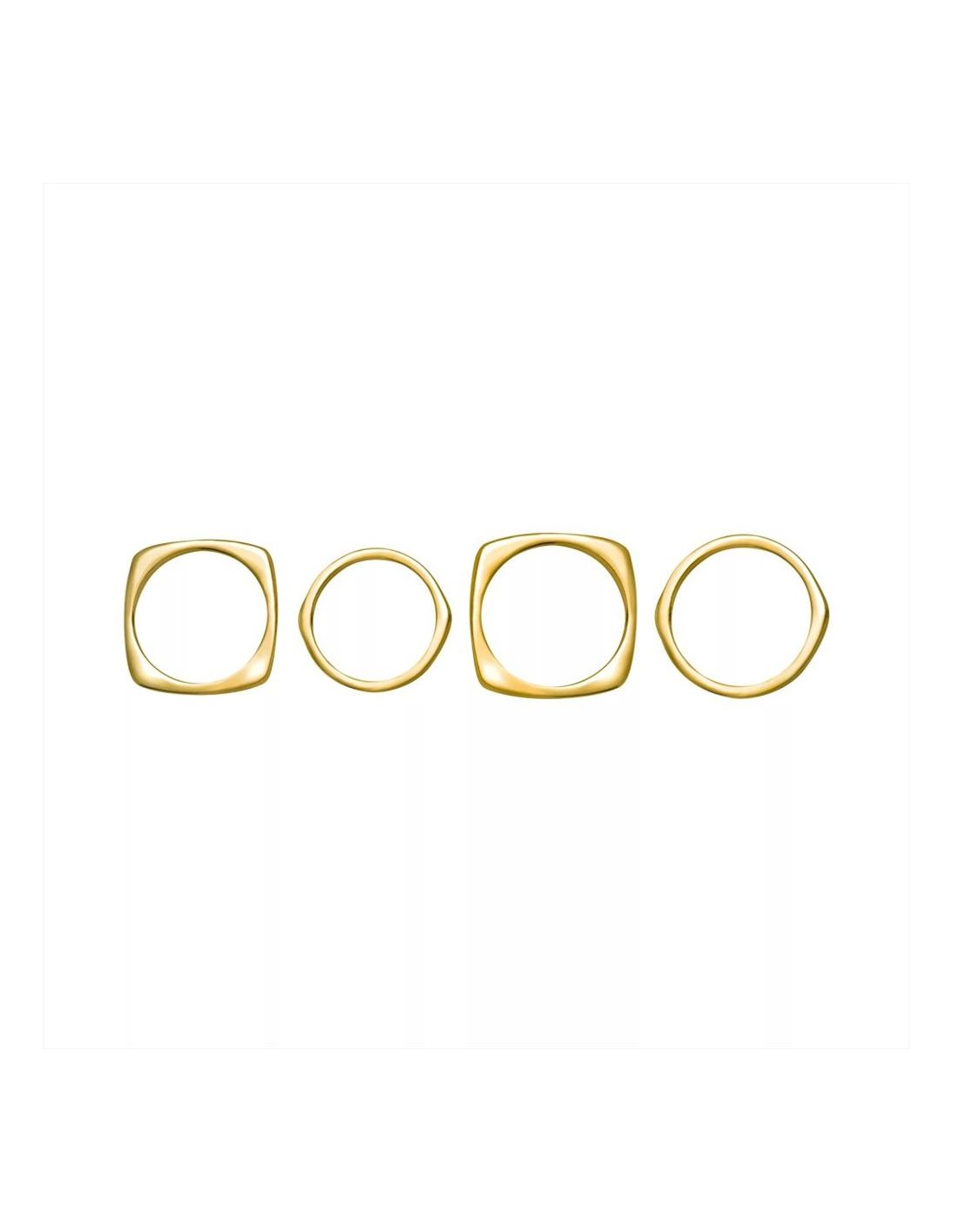 Anello Breil Tetra, da donna. Set di quattro anelli in acciaio dorato unisce forme e misure diverse: due anelli a doppia goccia (taglie 6 e 16) e due anelli squadrati (taglie 12 e 16). Ogni pezzo è pensato per essere indossato su un dito diverso, per vestire la mano.