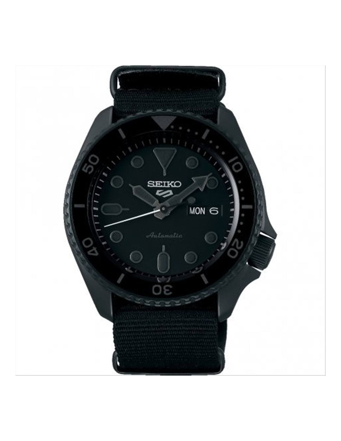 Orologio Seiko 5 Sports, solo tempo uomo. Cassa in acciaio pvd nero da 42 mm, quadrante nero con indici e lancette di colore nero, datario alle ore 3, ghiera girevole unidirezionale di colore nero, vetro minerale, movimento automatico con capacità di carica manuale e riserva di carica di circa 41 ore,visibile attraverso il fondello. Cinturino in nylon nero. Impermeabilità di 10 atm.