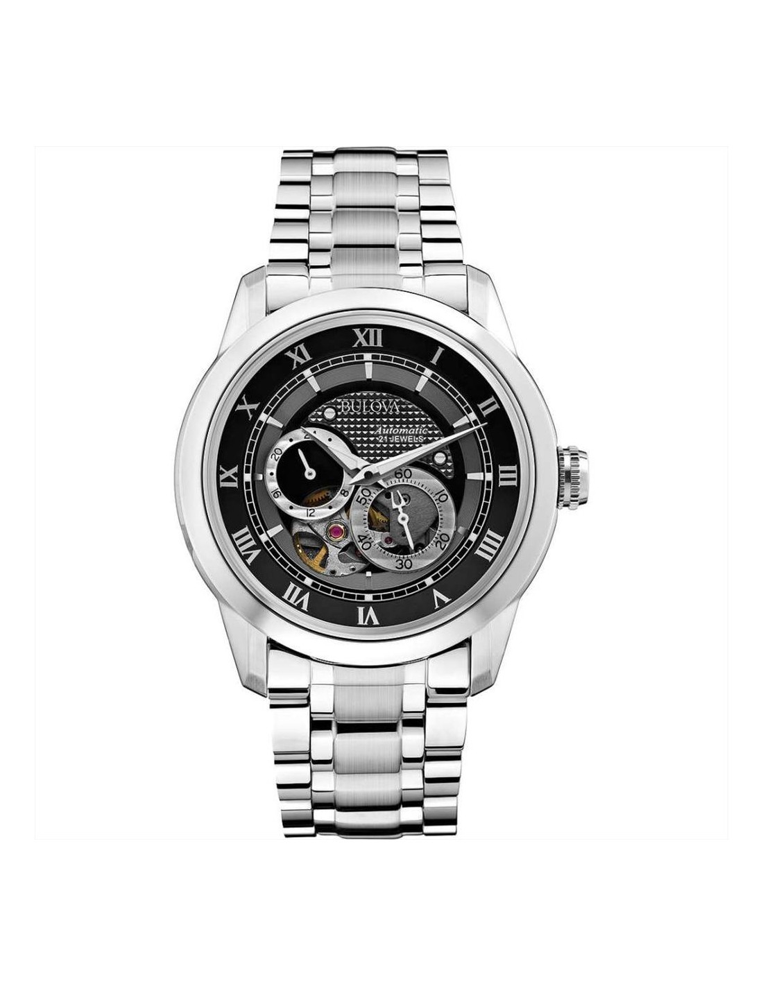 Orologio Bulova Bva Series, uomo. Cassa in acciaio da 43 mm, quadrante nero con numeri romani e lancette luminescenti, vetro minerale, movimento automatico visibile sia sul quadrante che attraverso il fondello, e cinturino in acciaio silver. Impermeabilità di 3 atm.