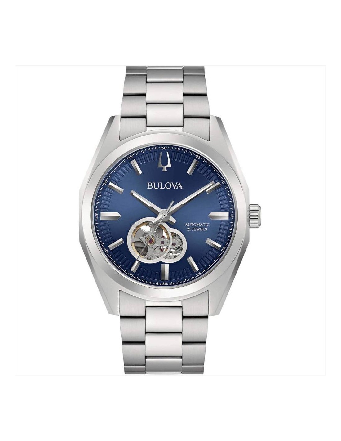 Orologio Bulova Surveyor, solo tempo uomo. Cassa in acciaio da 42 mm, quadrante blu con indici silver e lancette luminescenti, vetro minerale, movimento automatico visibile sia sul quadrante che attraverso il fondello, e cinturino in acciaio silver. Impermeabilità di 3 atm.