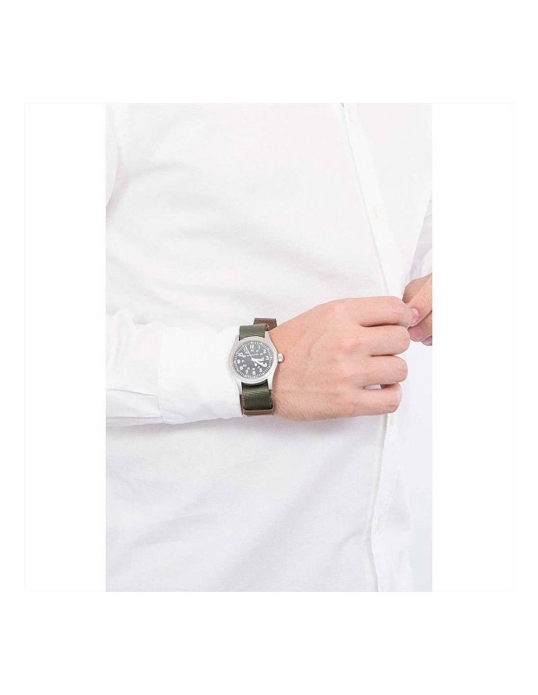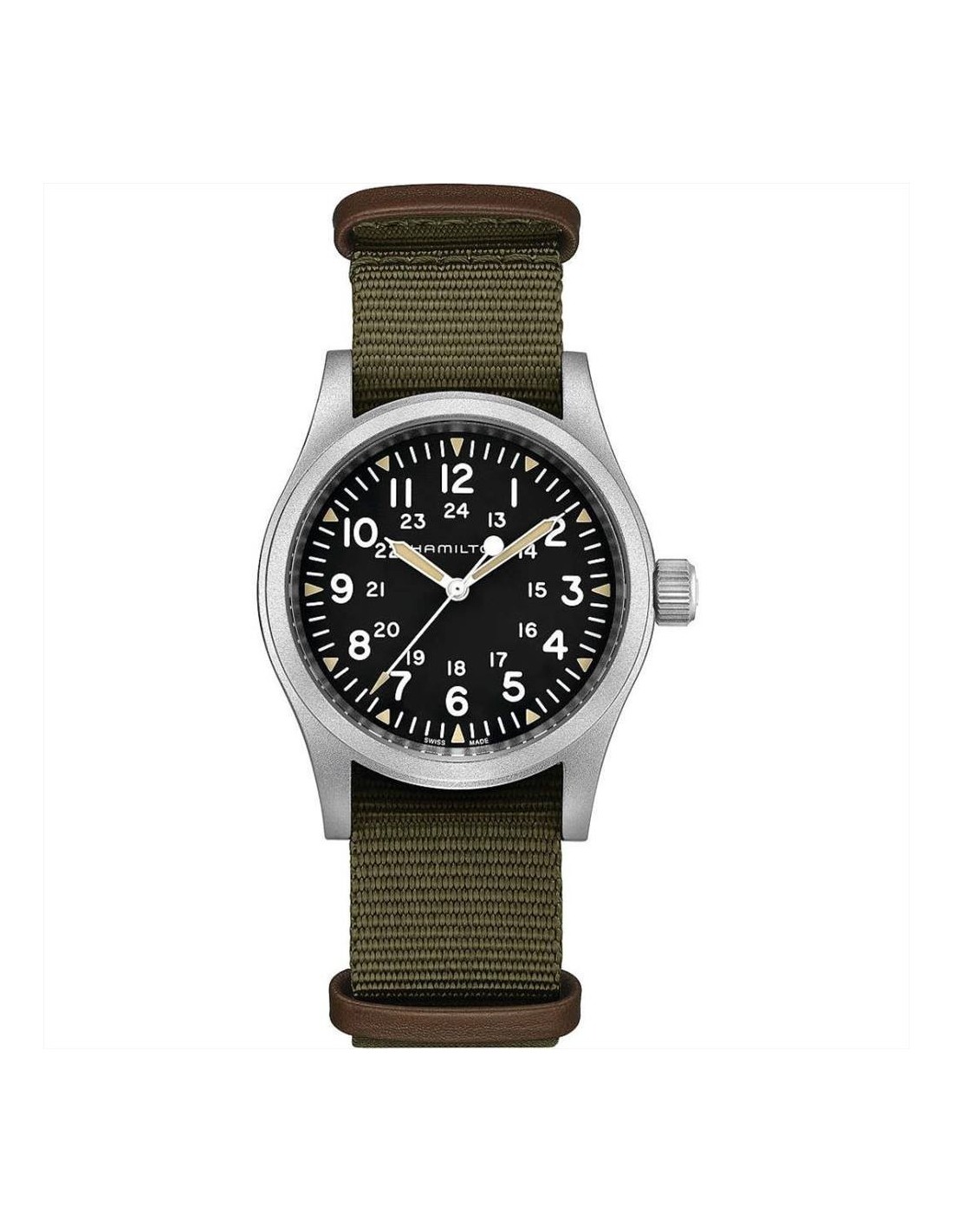 Orologio Hamilton Khaki Field Mechanical, solo tempo uomo. Cassa in acciaio opaco da 38 mm, quadrante nero con numeri arabi e lancette luminescenti, e vetro zaffiro antigraffio. Cinturino in tessuto NATO color verde e pelle marrone. Impermeabilità di 5 atm. Movimento H-50 a carica manuale e riserva di carica estesa da 80 ore. Il nuovo Khaki Field Mechanical è una riproduzione fedele del suo predecessore degli anni Sessanta e si inserisce alla perfezione nella tradizione militare di Hamilton. Costruito per durare, è l'orologio militare per eccellenza.