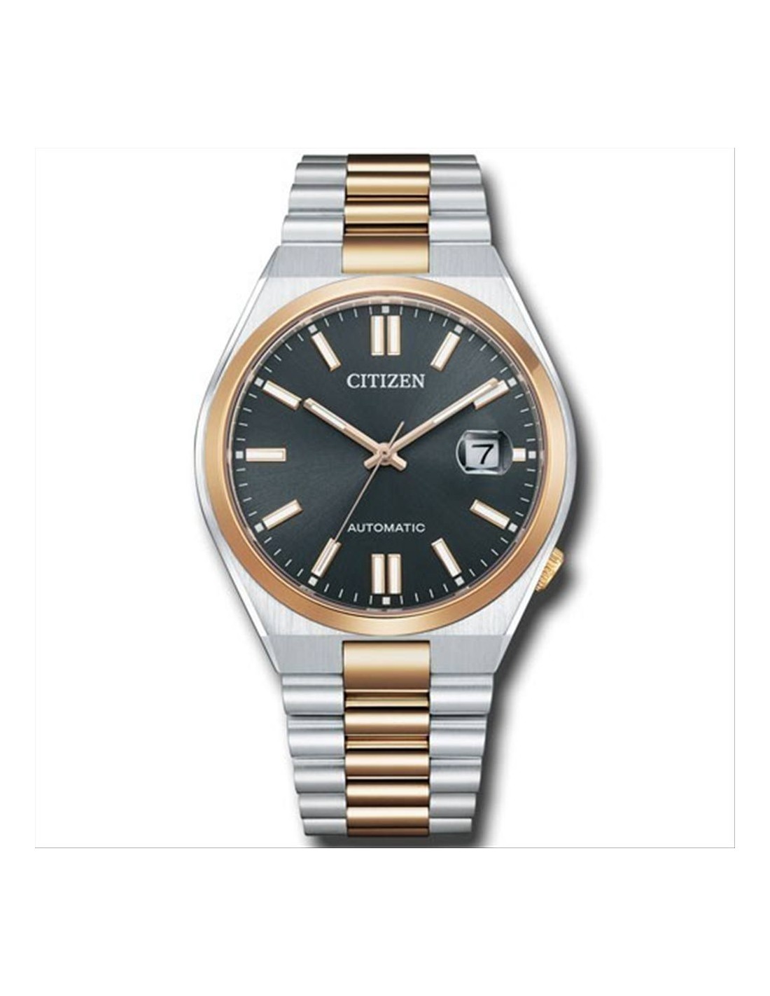 Orologio Citizen Automatico, solo tempo uomo. Cassa in acciaio da 40 mm, quadrante nero con indici e lancette luminescenti, movimento automatico visibile attraverso il fondello con 40 ore di riserva di carica. Vetro zaffiro con lente sul quadrante e datario ore 3. Cinturino in acciaio bicolore silver/ rosè. Impermeabilità di 5 atm.