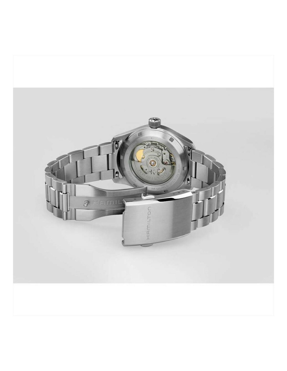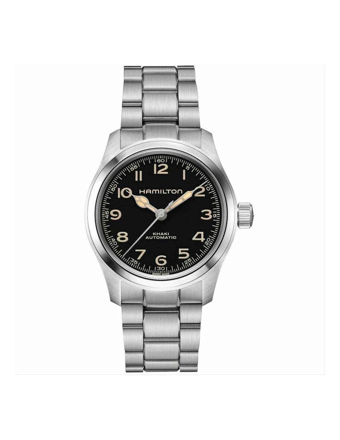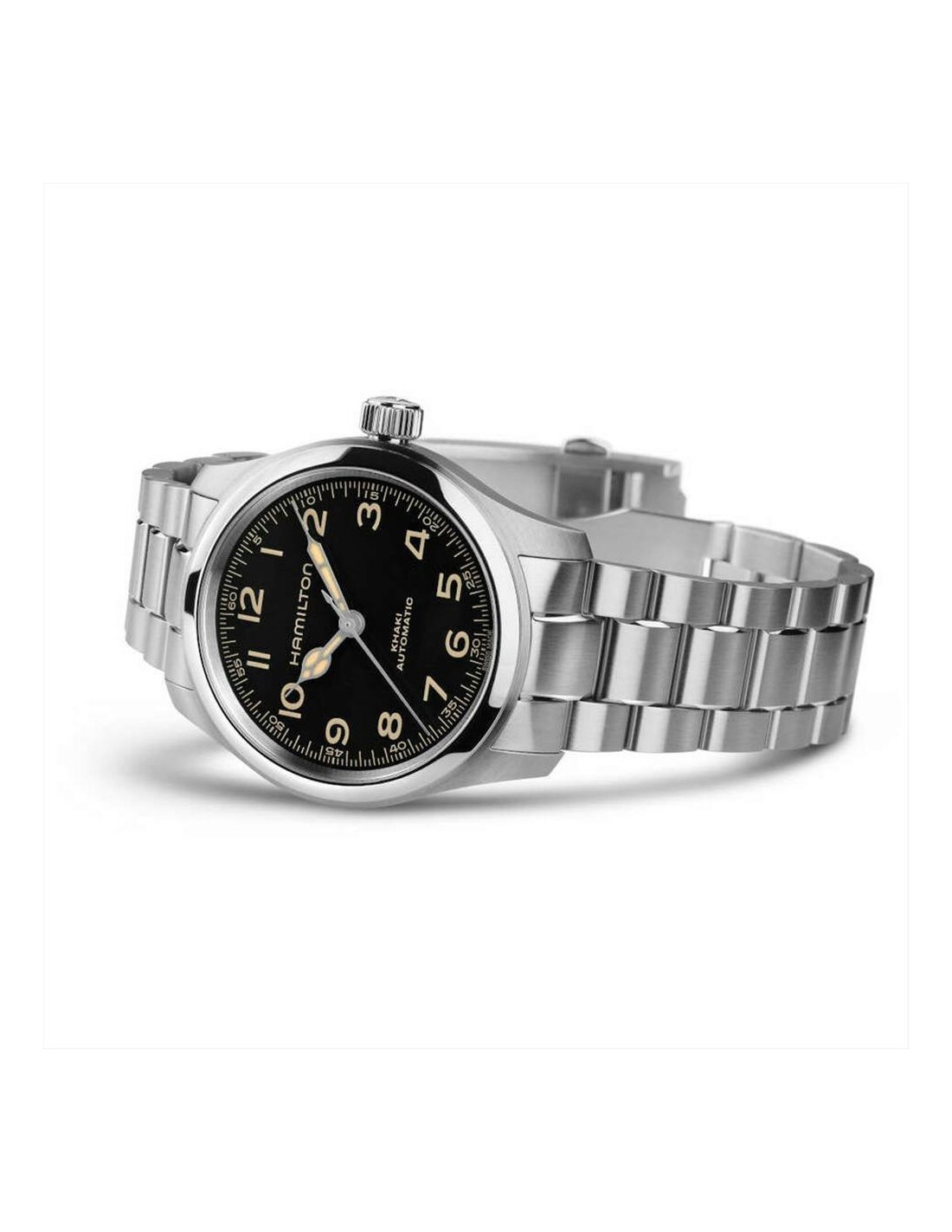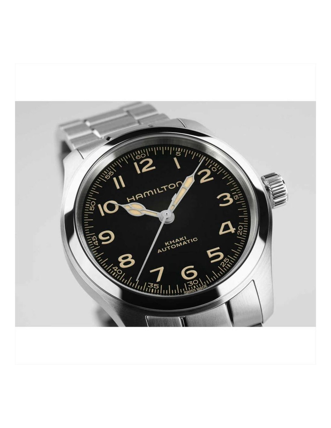 Orologio Hamilton Khaki Field Murph, solo tempo, indossato al polso da un personaggio di nome Murph nel famosissimo film americano Interstellar. Cassa in acciaio da 38 mm, quadrante nero con numeri leggermente bombati, e sfere a forma di cattedrale. Movimento meccanico svizzero Hamilton H-10 (basato sull'ETA C07.611 costruito sull'ETA 2824-2) ticchetta in modo affidabile con carica automatica. Funziona a una frequenza di 21.600 semi-frequenze all'ora, ha 25 rubini e, una riserva di carica estesa di 80 ore. La macchina ha anche una funzione di "hacking" e la possibilità di carica manuale della corona. Vetro zaffiro con trattamento antiriflesso. Impermeabilità di 10 atm.