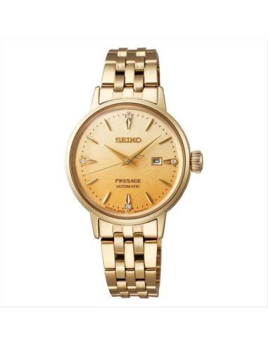 Orologio Seiko Presage Cocktail, si ispira al cocktail Sky Diving e con la texture leggera del suo quadrante richiama l'azzurro del cielo. Solo tempo donna. Cassa in acciaio pvd oro giallo da 28 mm, richiama le tonalità morbide e stratificate del celebre "Eggnog", il liquore all’uovo reso famoso dal cinema americano, indici e lancette dorate, con quattro diamanti posizionati agli indici. Datario alle ore 3. Vetro minerale, movimento automatico con riserva di carica di circa 40 ore. Cinturino in acciaio pvd oro giallo. Impermeabilità di 5 atm.