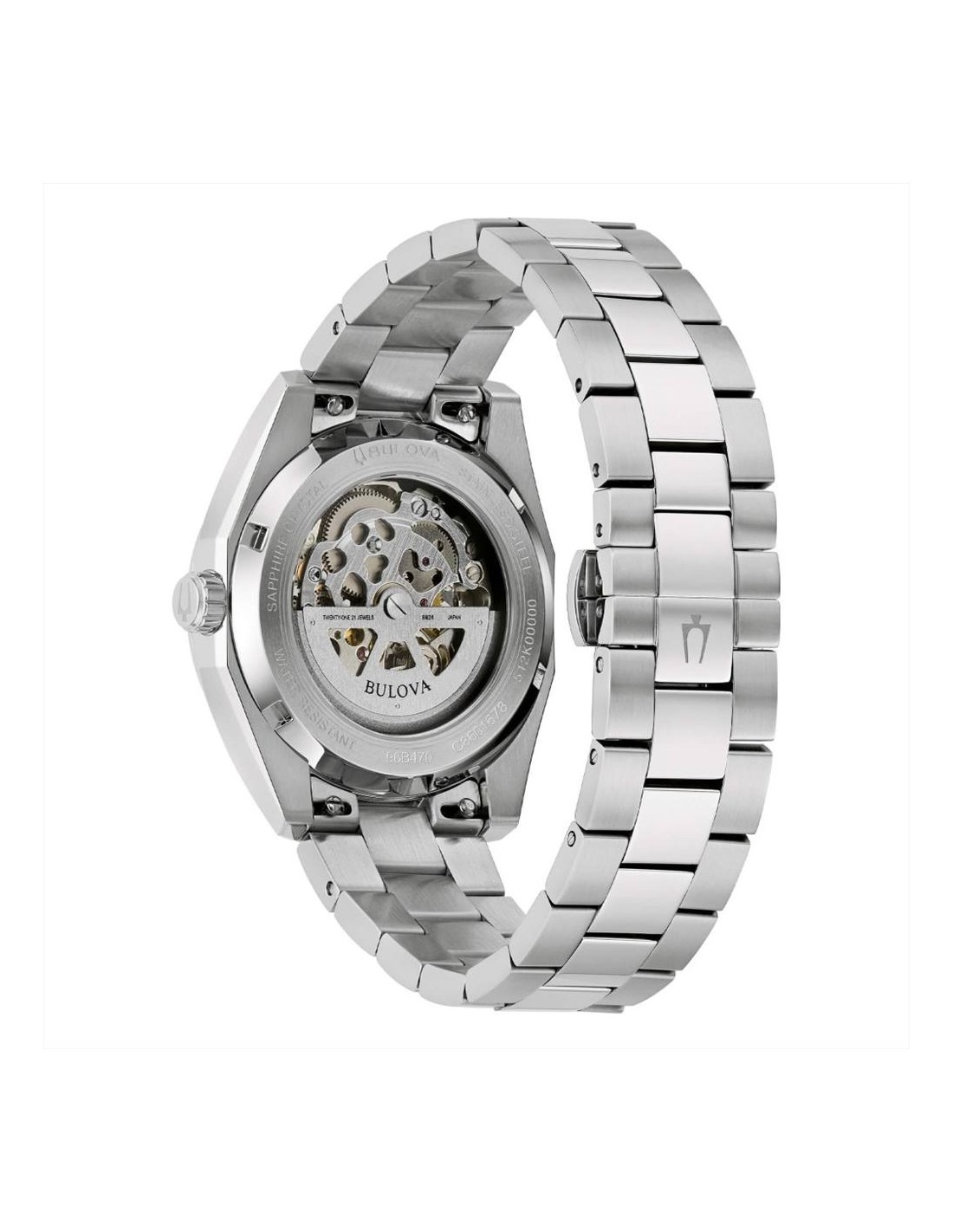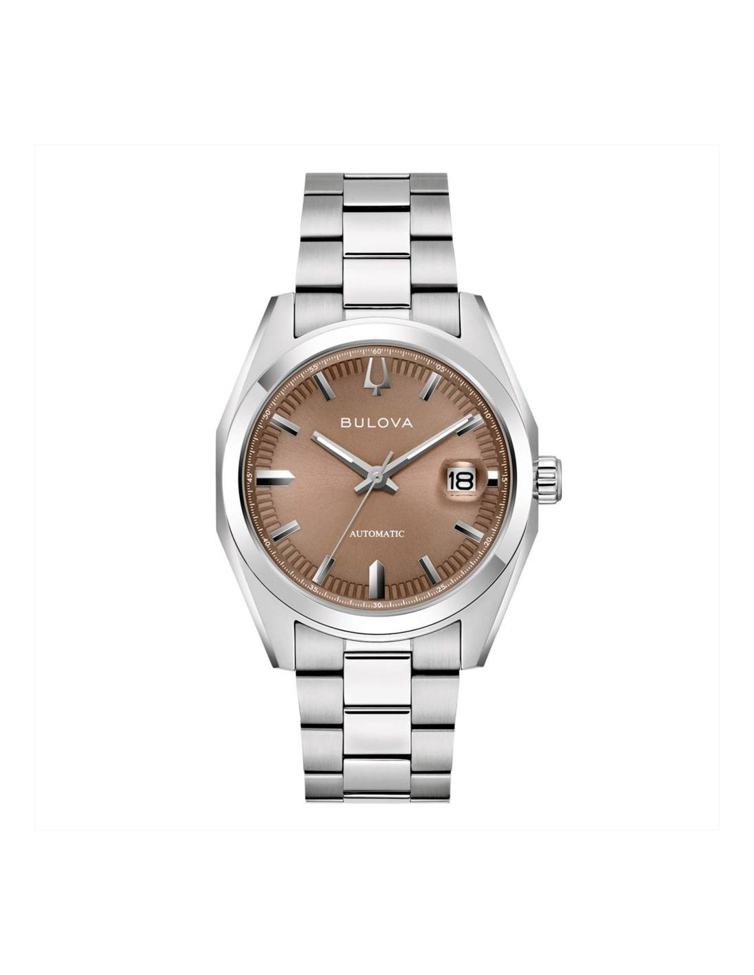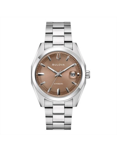 Orologio Bulova Surveyor Automatic, solo tempo uomo. Cassa in acciaio da 39 mm, quadrante color bronzo chiaro con indici e lancette luminescenti. Datario a ore 3. Vetro minerale, movimento automatico visibile sia sul quadrante che attraverso il fondello con riserva di carica di 40 ore, e cinturino in acciaio. Impermeabilità di 3 atm.