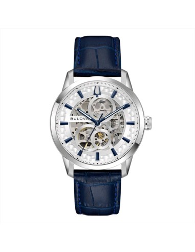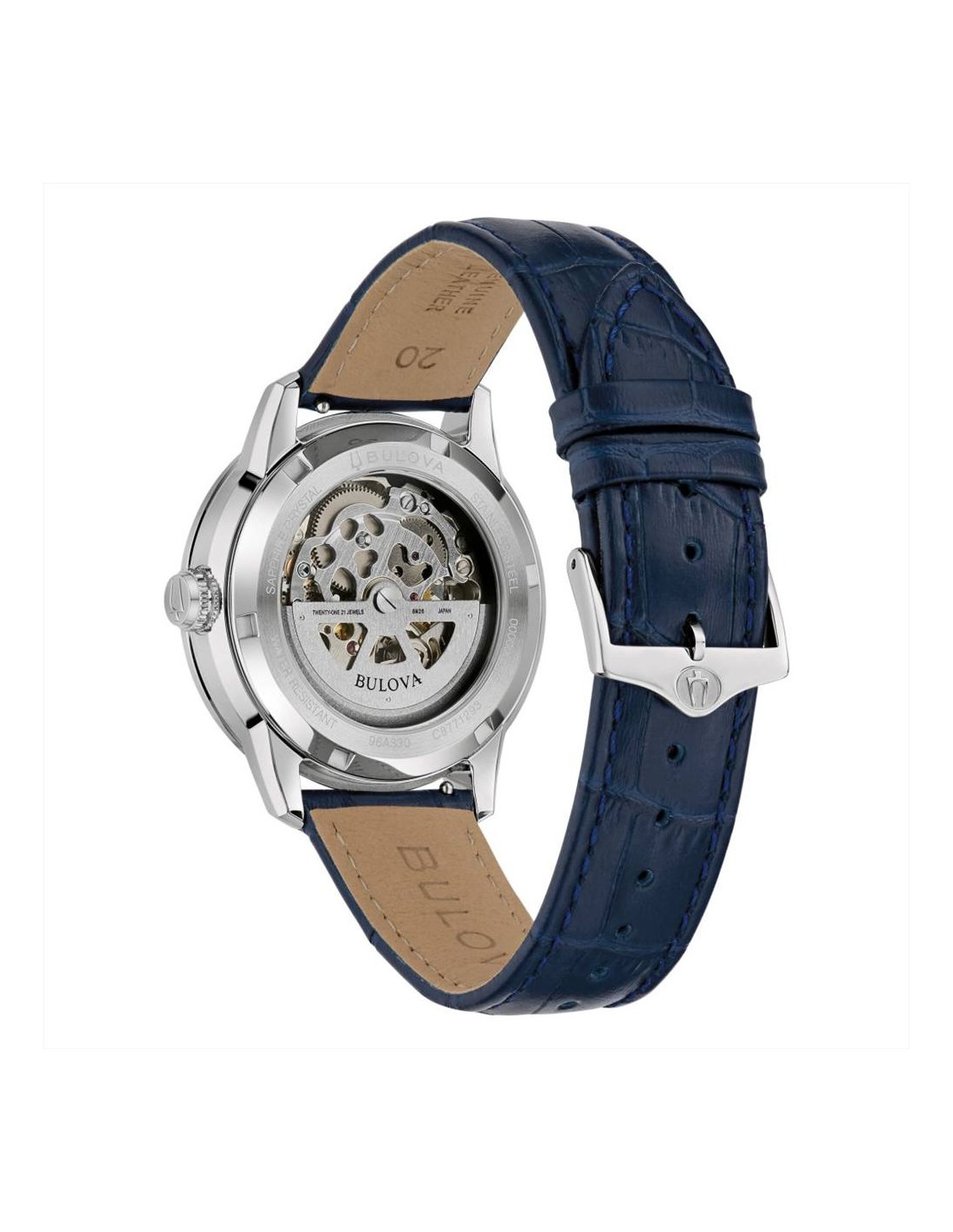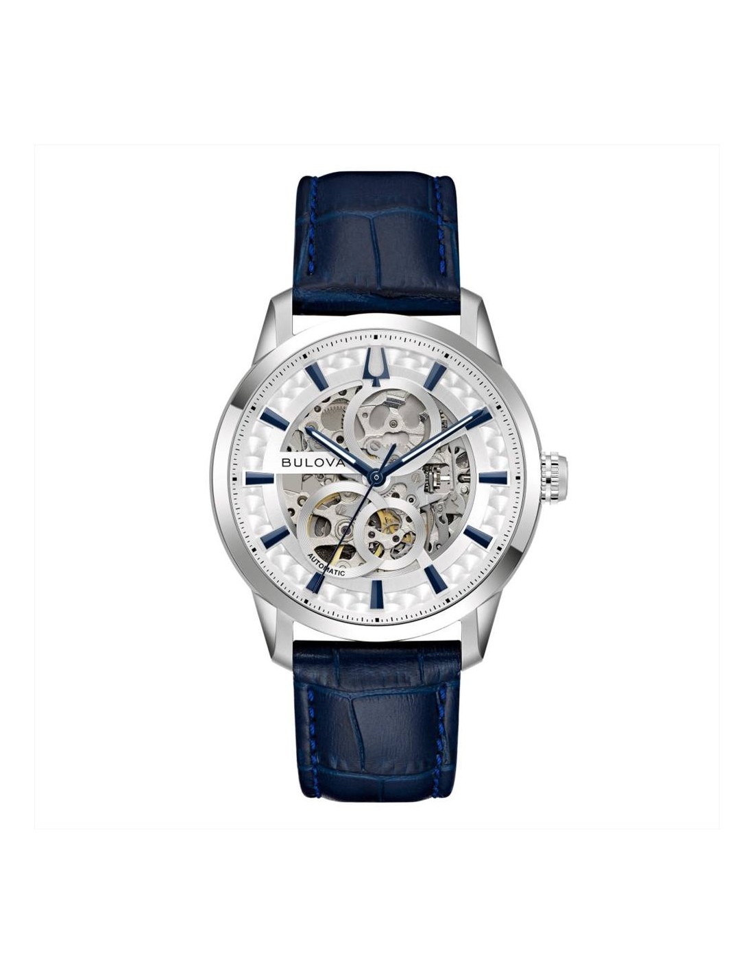 Orologio Bulova Sutton Skeleton 40mm, solo tempo uomo. Cassa in acciaio da 40 mm, quadrante bianco con indici e lancette blu, vetro minerale, movimento automatico visibile sia sul quadrante che attraverso il fondello con riserva di carica di 40 ore, e cinturino in pelle blu. Impermeabilità di 3 atm.