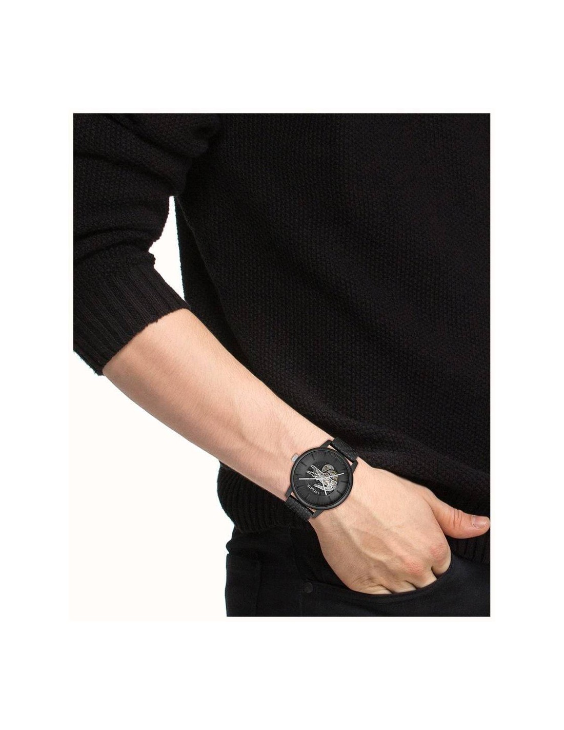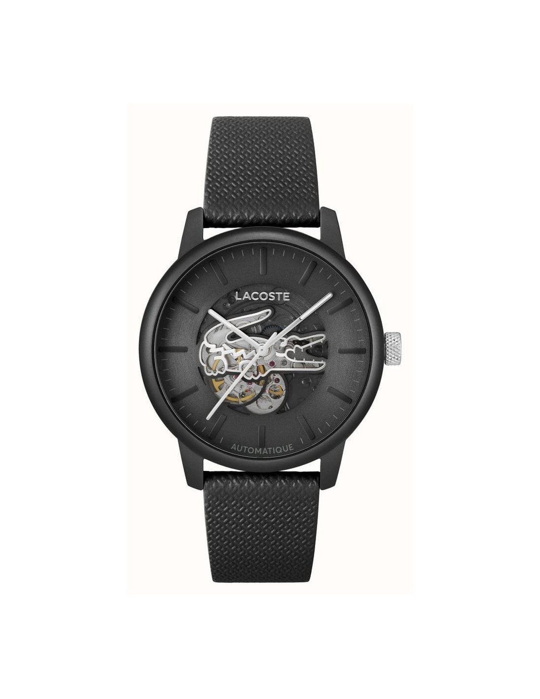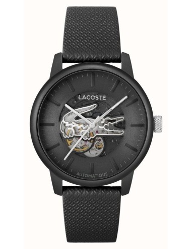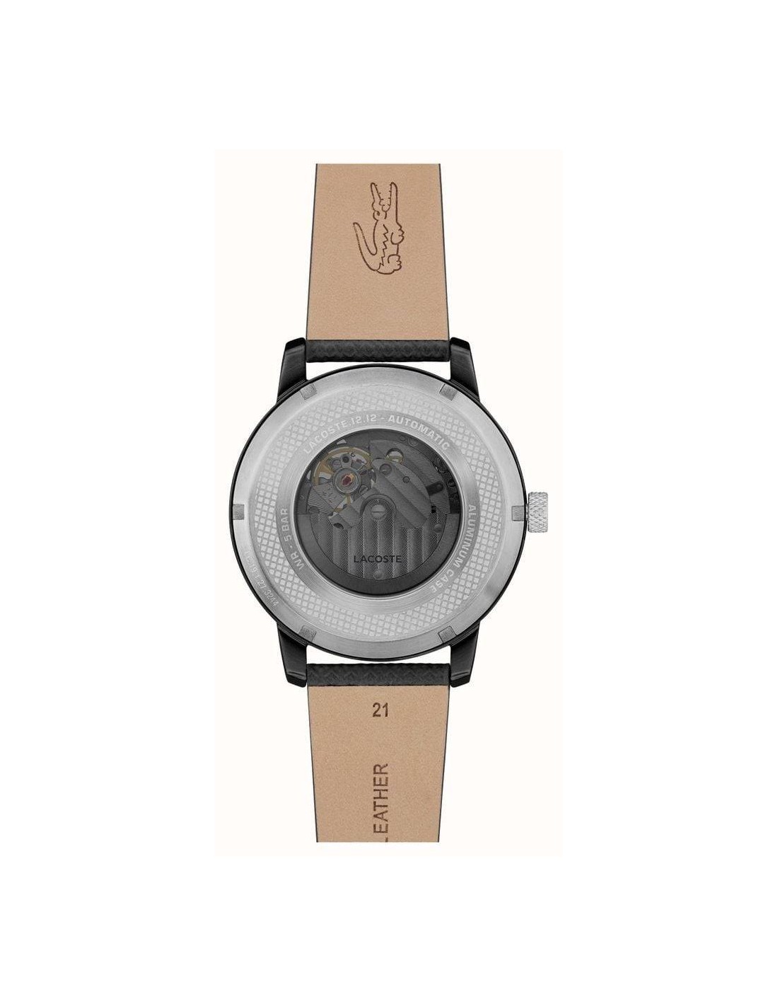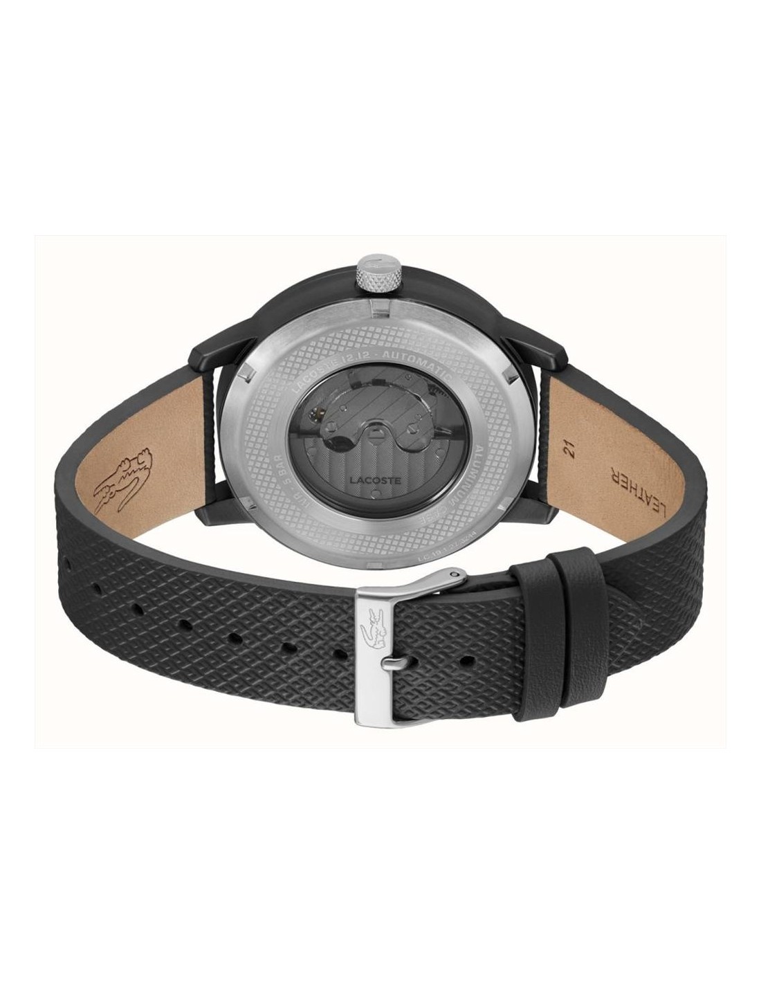 Orologio Lacoste 12.12, solo tempo uomo. Cassa in resina nera da 44 mm, quadrante nero a cuore aperto con il Logo del coccodrillo Lacoste al centro, indici neri e lancette luminescenti. Movimento automatico visibile sia nel quadrante che nel fondello. Vetro minerale. Cinturino in pelle nera che si chiude con una fibbia ad ardiglione. Impermeabilità di 3 atm.