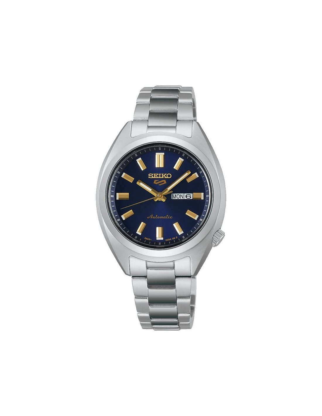 Orologio Seiko 5 Sport 'Hebitama' SNXS, donna. La cassa “Hebitama', nota per la sua silhouette arrotondata e distintiva, dona un look elegante e versatile, perfetto per l’uso quotidiano. Cassa in acciaio inossidabile di diametro 32 mm. Spessore 11,40 mm. Distanza tra le anse di 15 mm. Fondello avvitato trasparente. Corona a ore 4. Quadrante blu con indici e lancette dorati visibili anche al buio, datario a ore 3. Movimento meccanico automatico 2R06, 21600 alternanze orarie e 24 rubini. Vetro in minerale. Cinturino in acciaio. Impermeabilità di 10 atm.