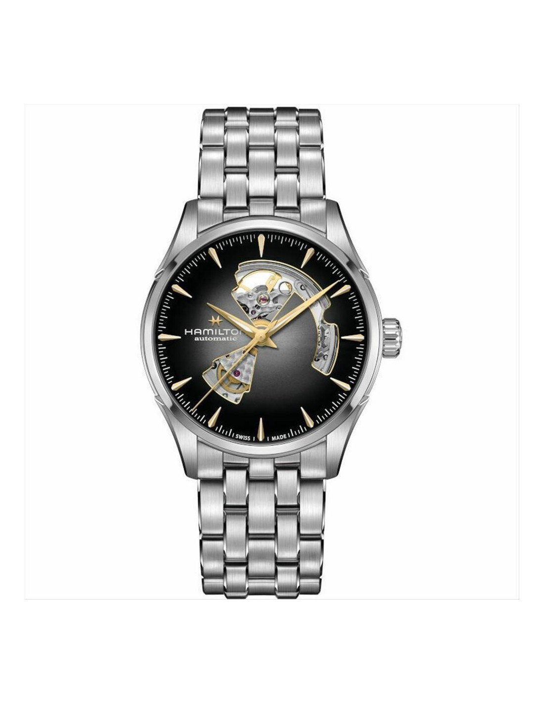 Orologio Hamilton Jazzmaster Open Heart 42mm, automatico uomo. La cassa, di forma rotonda con un diametro di 42 mm, è realizzata in acciaio inossidabile. Vetro in cristallo zaffiro bombato e trattato contro i riflessi su entrambi i lati, fondello a vista. Il quadrante nero con finitura spazzolata soleil e dettagli fumè, e con vista che permette infatti di osservare il funzionamento degli ingranaggi dell’orologio. Indici dorati e lancette luminescenti. Movimento automatico H-10 con una riserva di carica di 80 ore e spirale in Nivachron, progettata per resistere ai campi magnetici e agli sbalzi termici. Cinturino in acciaio e impermeabilità di 5 atm