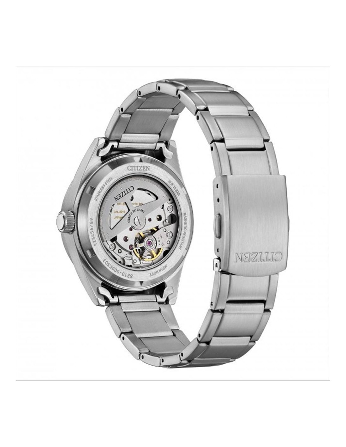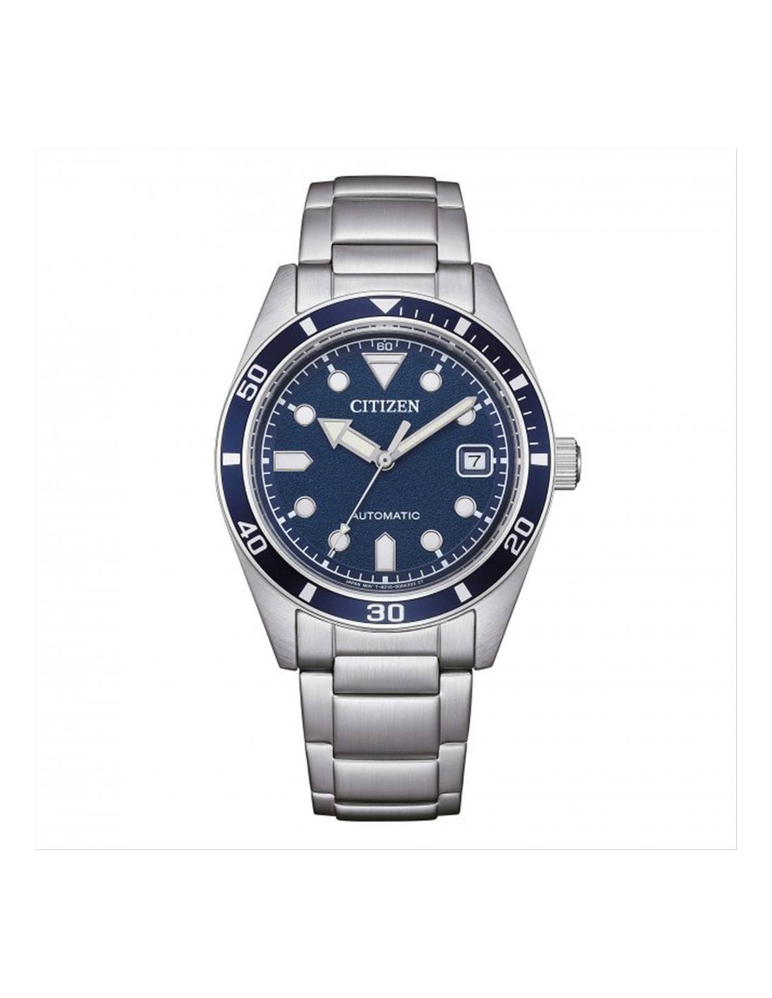 Orologio Citizen, solo tempo uomo. Cassa in acciaio silver da 38,5 mm, quadrante blu con indici e lancette luminescenti, datario alle ore 3. Movimento automatico a 21 rubini visibile attraverso il fondello con riserva di carica di 38 ore. Vetro minerale, e cinturino in acciaio. Impermeabilità di 10 atm.
