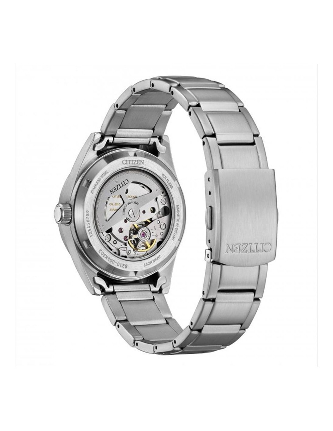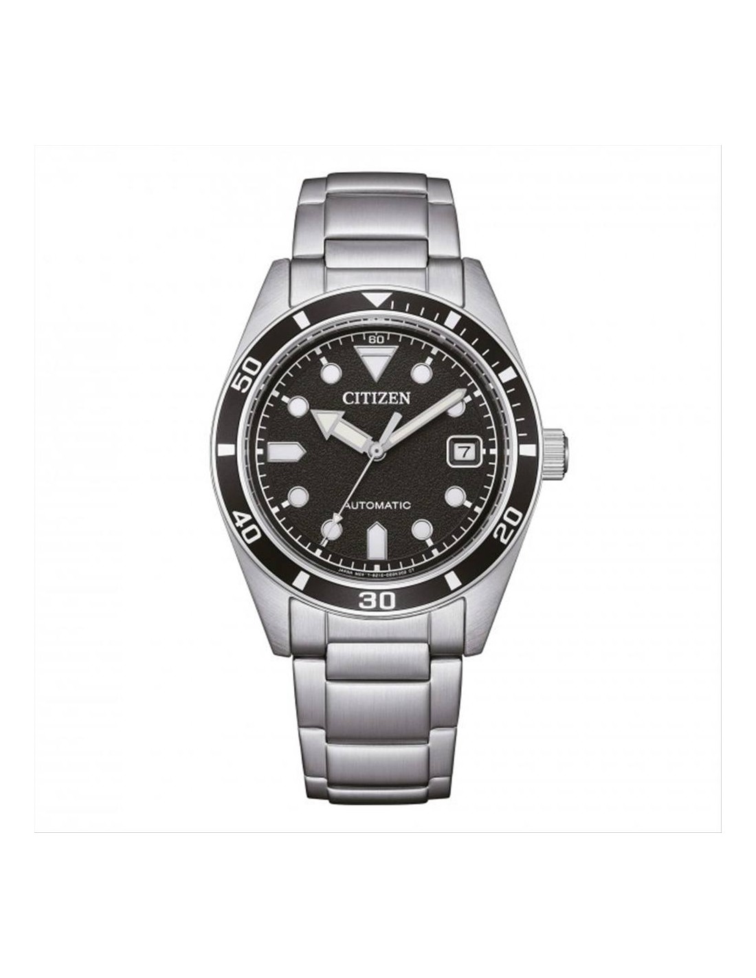 Orologio Citizen, solo tempo uomo. Cassa in acciaio silver da 38,5 mm, quadrante nero con indici e lancette luminescenti, datario alle ore 3. Movimento automatico a 21 rubini visibile attraverso il fondello con riserva di carica di 38 ore. Vetro minerale, e cinturino in acciaio. Impermeabilità di 10 atm.