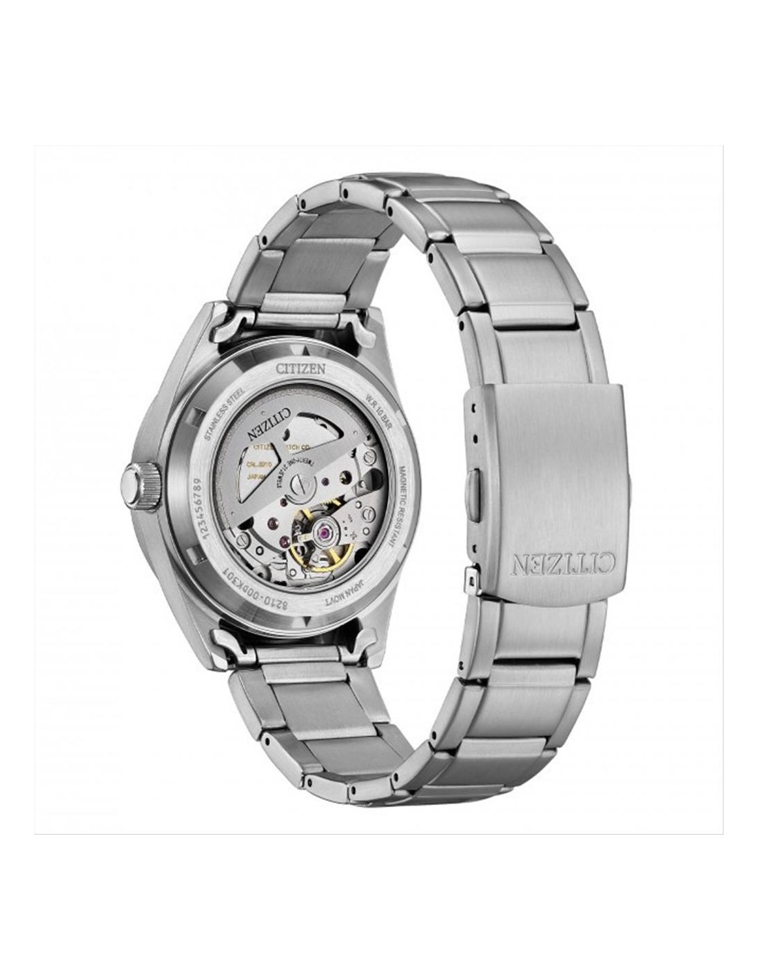 Orologio Citizen, solo tempo uomo. Cassa in acciaio silver da 38,5 mm, quadrante verde con indici e lancette luminescenti, datario alle ore 3. Movimento automatico a 21 rubini visibile attraverso il fondello con riserva di carica di 38 ore. Vetro minerale, e cinturino in acciaio. Impermeabilità di 10 atm.