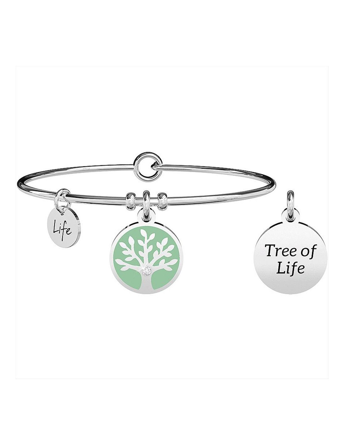 Bracciale Kidult Nature, modello rigido, in acciaio 316L ipoallergenico con ciondolo smaltato. Diametro massimo 6.5 cm, adatto a polsi di circonferenza fino a 20 cm. Chiusura apribile per un inserimento più pratico. Albero Della Vita: "Rami che seguono la forma del vento, chiome che tendono all’infinito. Le sue radici sono l’anima del futuro, al suo interno scorre linfa che genera vita. Il collegamento profondo tra l’uomo e la Madre Terra.'
