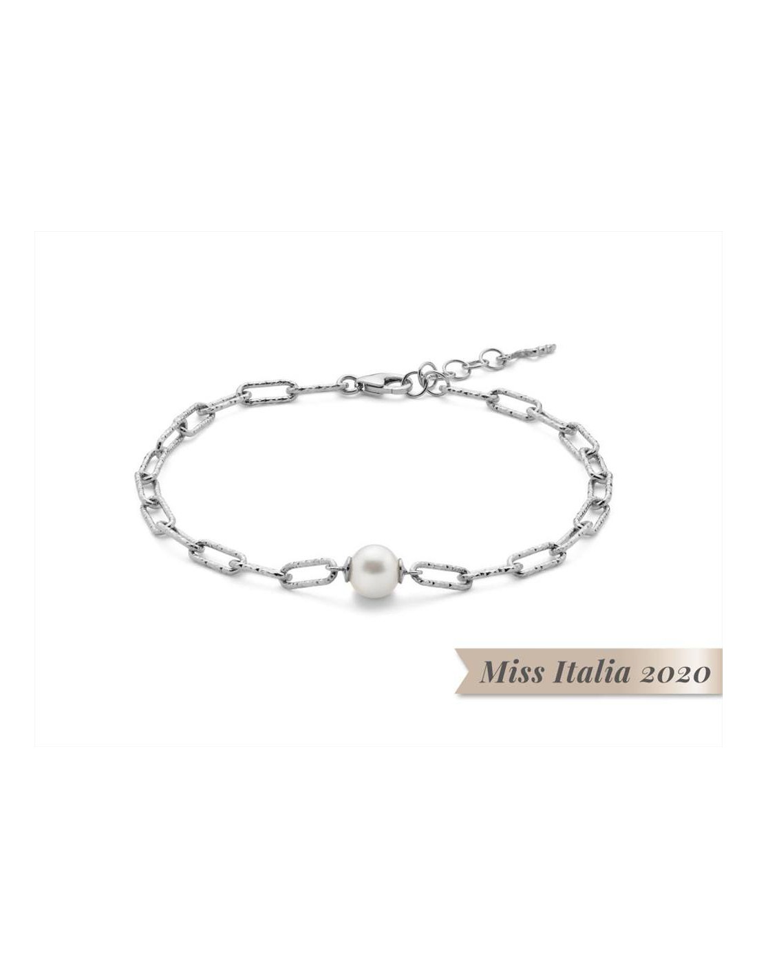 Bracciale Miluna Miss Italia, maglia a catena da 9 mm con speciale lavorazione diamantata in argento 925 e con perla coltivata bianca ø 7-7,5. Lunghezza bracciale da 17,5 cm fino a 19,5 cm grazie all'uso degli anellini di allungo presenti nell'estremità vicino alla chiusura con esclusivo monogramma Miluna.