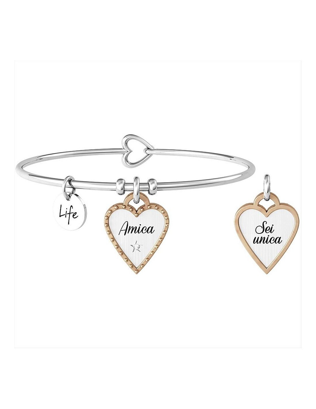 Bracciale Kidult Love, in acciaio con ciondolo satinato a cuore allungato con rifinitura borchiata color oro rosa e cristallo. Incisione smaltata e cristallo sul ciondolo. Chiusura a cuore. Misura unica, diametro 6 cm. CUORE | AMICA SEI UNICA "Sei un'amica vera e sincera, pazza quanto basta per essermi sempre accanto! Come te nessuna al mondo, sei unica!"