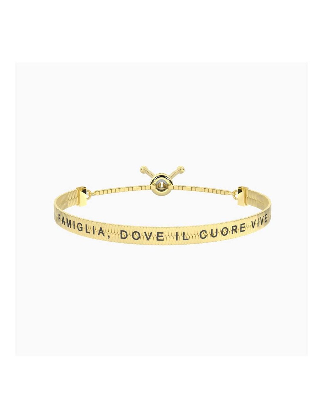 Bracciale Kidult Family, da donna regolabile con catena veneta in herringbone e acciaio dorato lucido e satinato. Scritta "Famiglia, dove il cuore vive". Dimensione catena veneta: 1,75 mm. Dimensione catena herringbone: 5 mm. Misura regolabile, da 15 a 23 cm