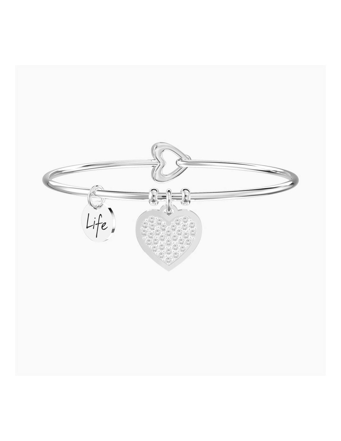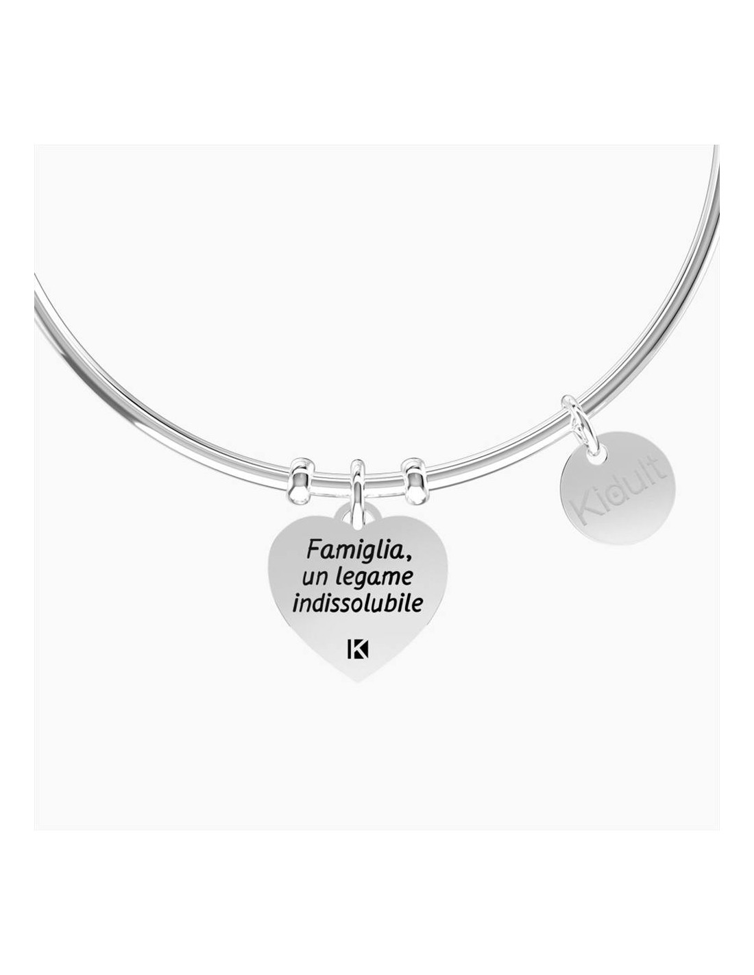 Bracciale Kidult Family, modello rigido, in acciaio con ciondolo a forma di cuore con cristalli e scritta "Famiglia, un legame indissolubile". Misura unica, circonferenza 20 cm. Chiusura a cuore.