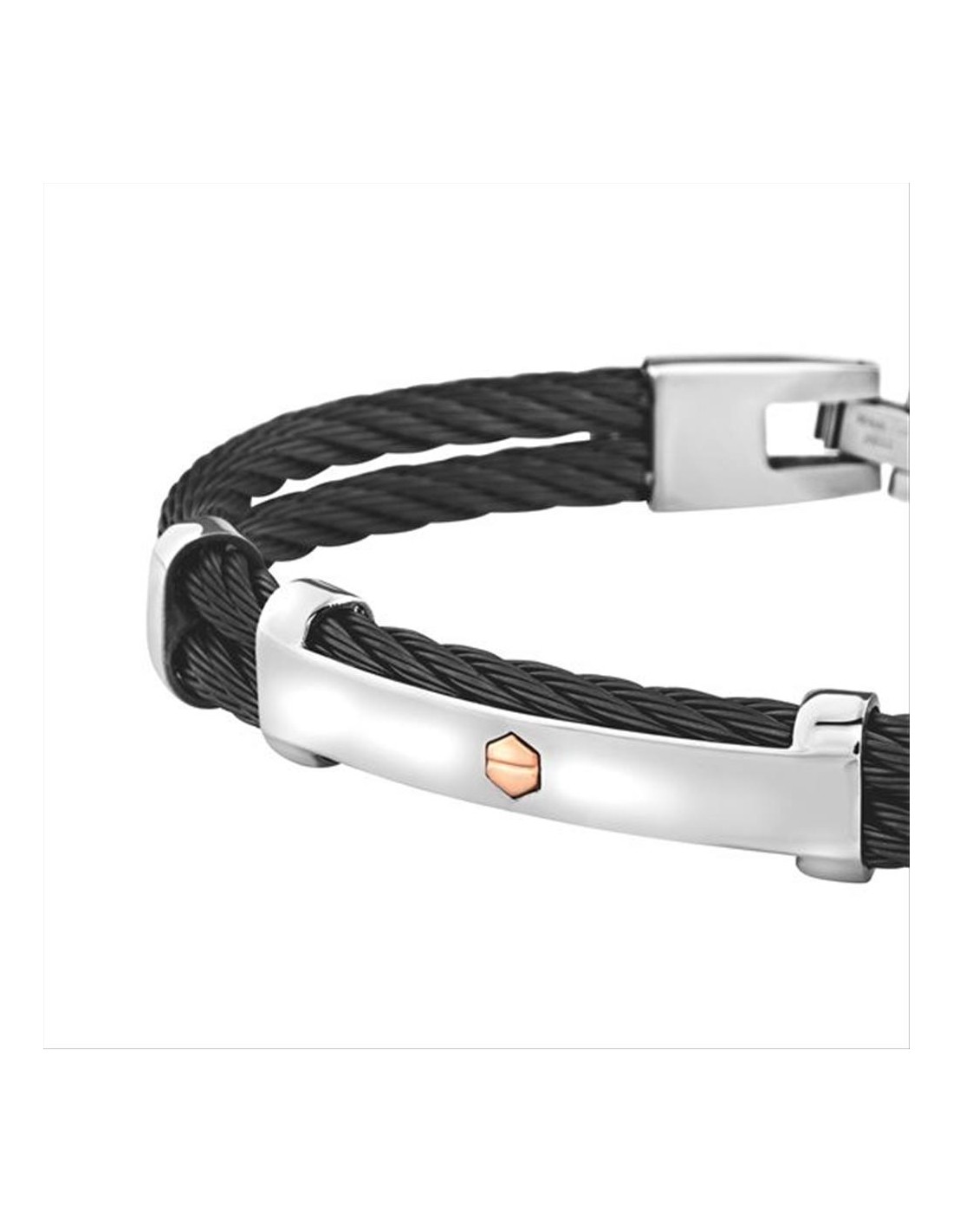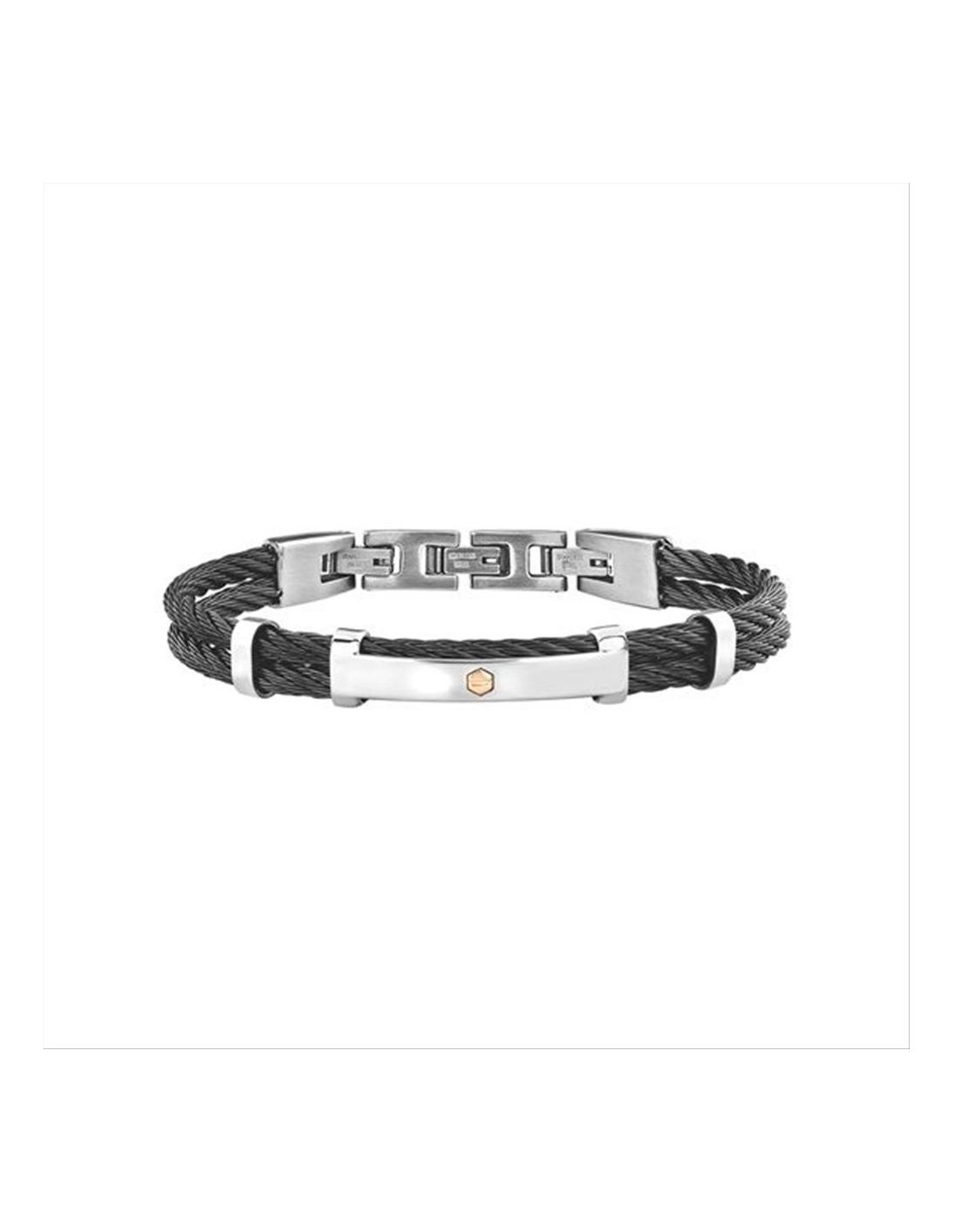 Bracciale Breil 9K Loop, da uomo, modello rigido, caratterizzato da due sottili cavetti in acciaio color gun, arricchiti da un elemento centrale silver decorato con una vite esagonale in oro 9K. Chiusura a gioielleria. Lunghezza minima 17.5 cm. Lunghezza massima 20.3 cm.