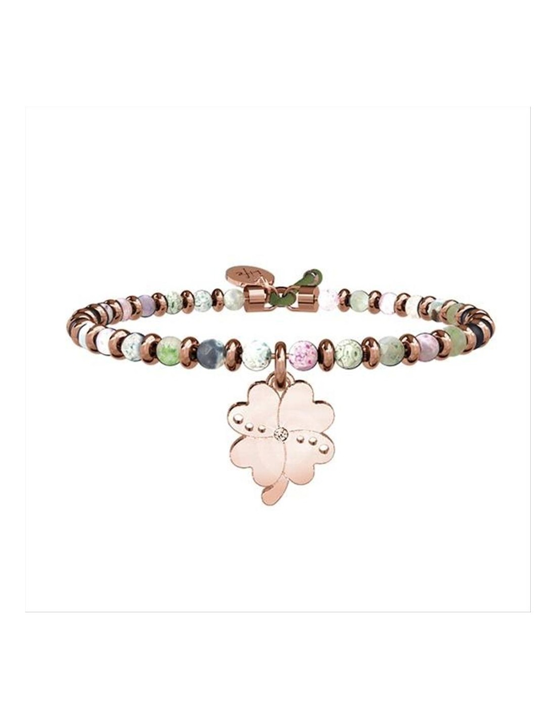 Bracciale Kidult Nature, modello rigido da donna, in acciaio rosè, agata multicolore e ciondolo a forma di quadrifoglio. Diametro massimo 6.5 cm, adatto a polsi di circonferenza fino a 20 cm. Quadrifoglio/Fortuna "Il prato nasconde un verde talismano, se la fortuna ti vede ti prende per mano. Ricchezza, amore e amicizia sincera, con quattro foglie il tuo sogno si avvera!"