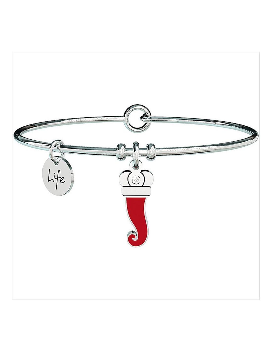 Bracciale Kidult Symbols, modello rigido, in acciaio 316L ipoallergenico con ciondolo a forma di cornetto in smato rosso. Diametro massimo 6.5 cm, adatto a polsi di circonferenza fino a 20 cm. Chiusura apribile per un inserimento più pratico. Cornetto/Protezione: "È l’arma per vincere ogni tua sfida, ti protegge dai guai che riserva la vita. Allontana l’invidia del male qui intorno, toccalo sempre, ogni mese, ogni giorno."