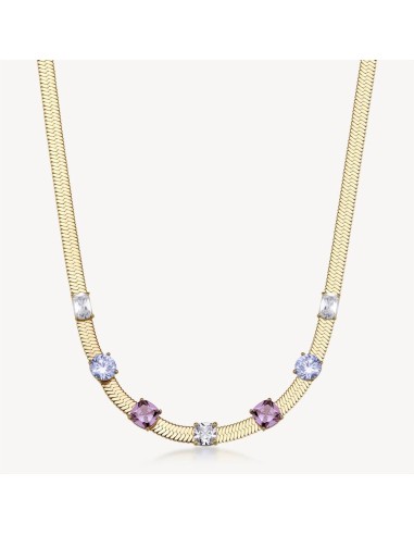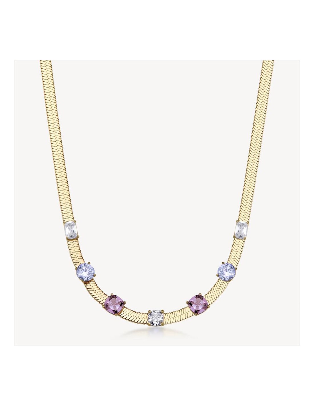 Collana Brosway Dreaming, girocollo in acciaio 316L e finitura pvd oro 14K, con round, cushion, square e baguette cubic zirconia colore ametista.