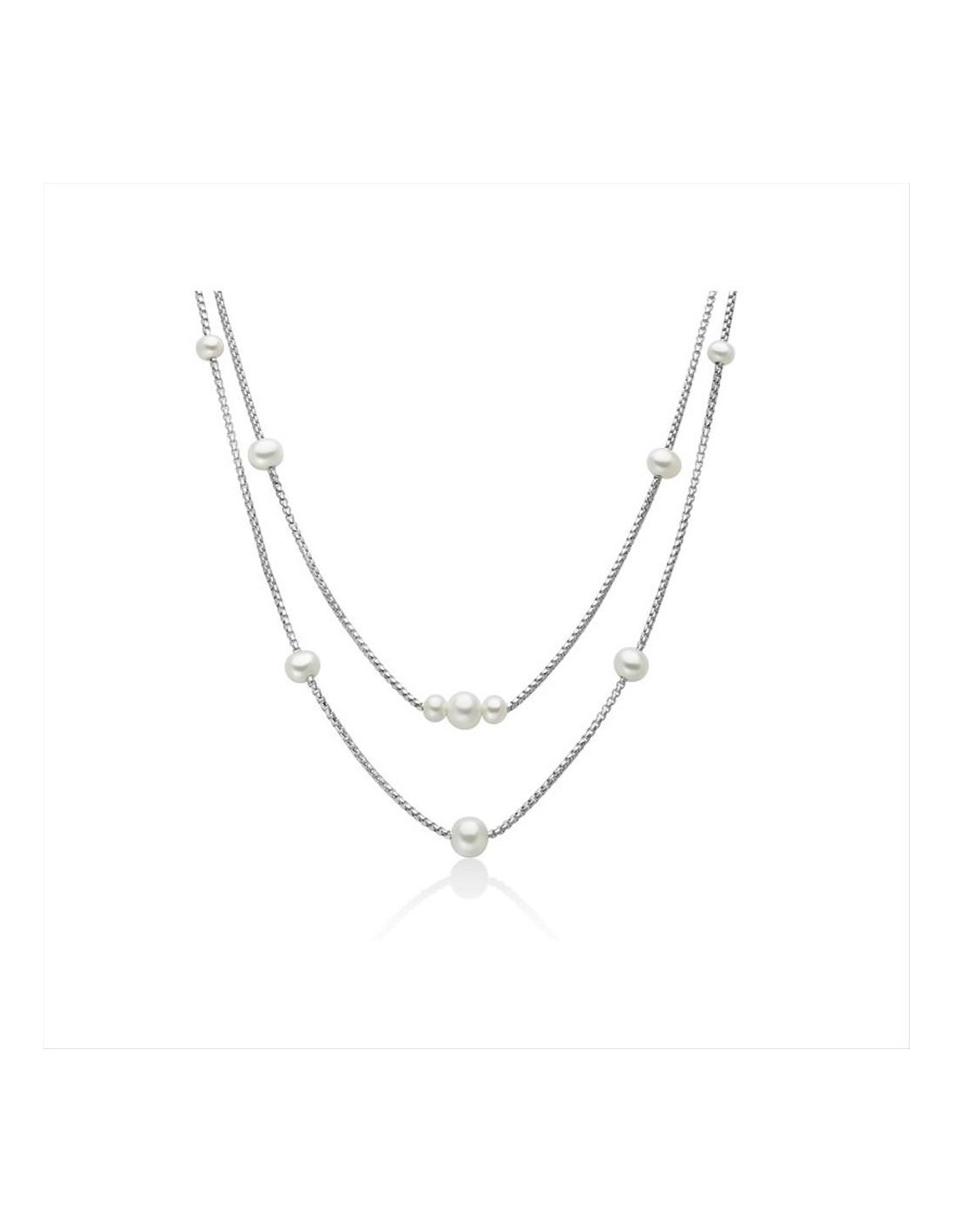 Collana Miluna della collezione "I Gioielli di Miss Italia", a due fili n argento 925/1000 e 4 perle vere Oriente bianche di dimensione 5-5,5 mm, 4 perle vere Oriente bianche di 6-6,5mm e 2 perle vere Oriente bianche di 7-7,5mm.