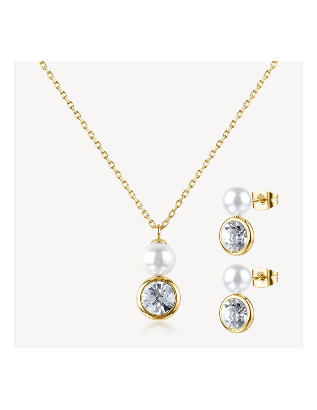 Set Collana e Orecchini Brosway Limited Edition, in acciaio 316L e finitura pvd oro 14K, con cristalli e perle di conchiglia.