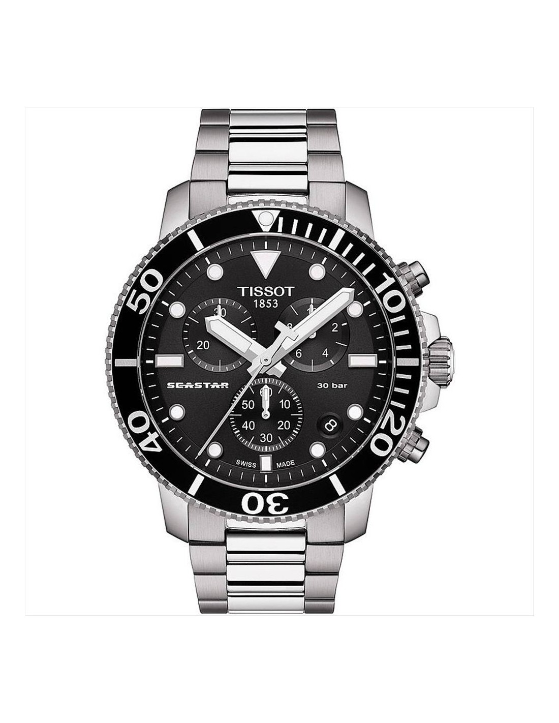 Orologio Tissot Seastar 1000, cronografo uomo. Cassa in acciaio silver da 45 mm, quadrante nero con indici e lancette luminescenti,e datario alle ore 4. Lunetta in acciaio nera. Vetro zaffiro antigraffio con trattamento antiriflesso, movimento al quarzo, e cinturino in acciaio silver. Impermeabilità di 30 atm (300 metri).