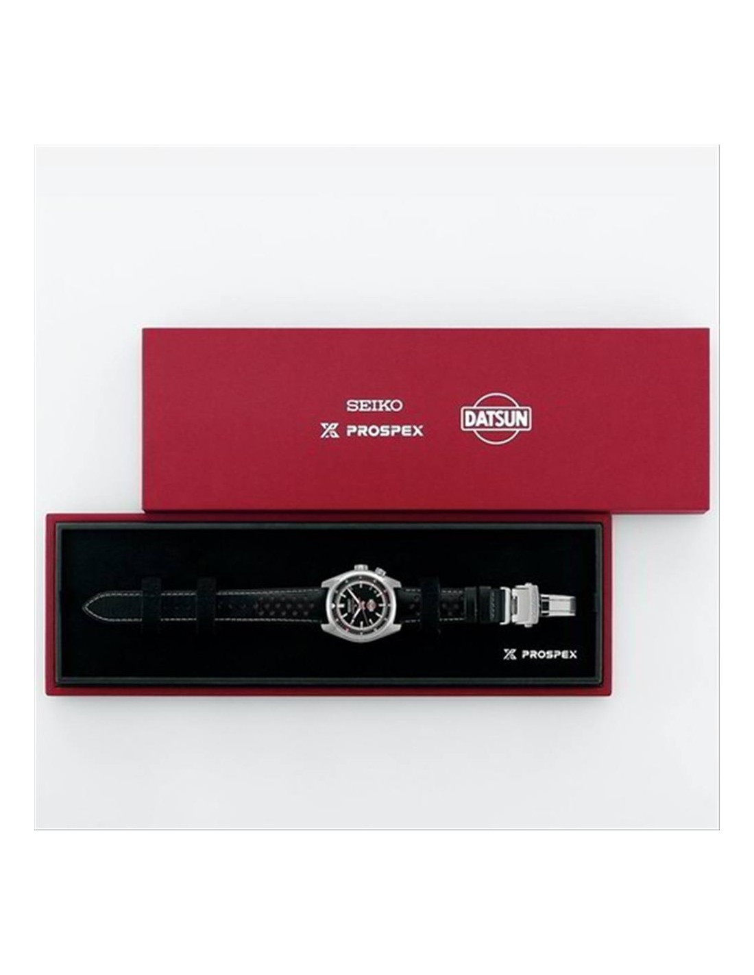 Orologio Seiko Prospex Speedtimer Datsun Limited, edizione limitata a 2.500 pezzi, dedicato alla Datsun 240Z mitica auto dell'East African Rally degli anni '70 . Il design riprende fedelmente i colori iconici del modello originale, con il logo DATSUN visibile sul quadrante, sul fondello e sulla fibbia. Cassa in acciaio da 39,5 mm, quadrante nero con indici silver e finiture bianche e rosse con logo Datsun per esaltarne l'animo sportivo. Movimento automatico seiko con riserva di 70 ore. Vetro zaffiro. Cinturino in pelle nera traforata con interno rosso come i guanti vintage da automobilismo. Impermeabilità di 10 atm.