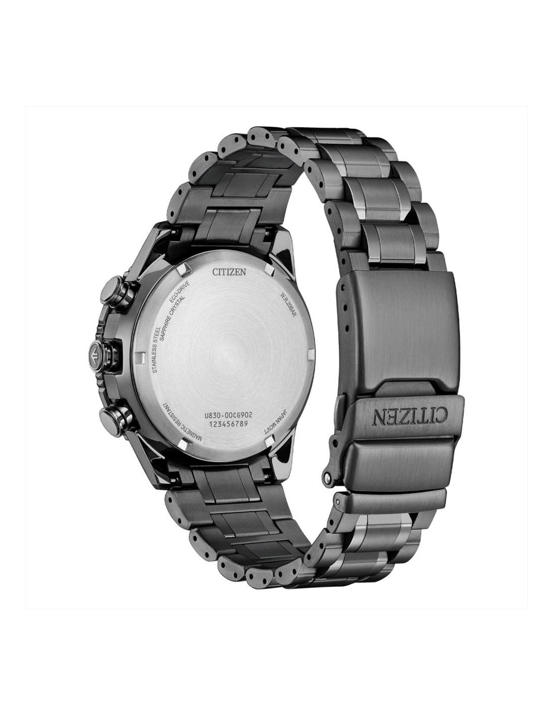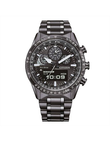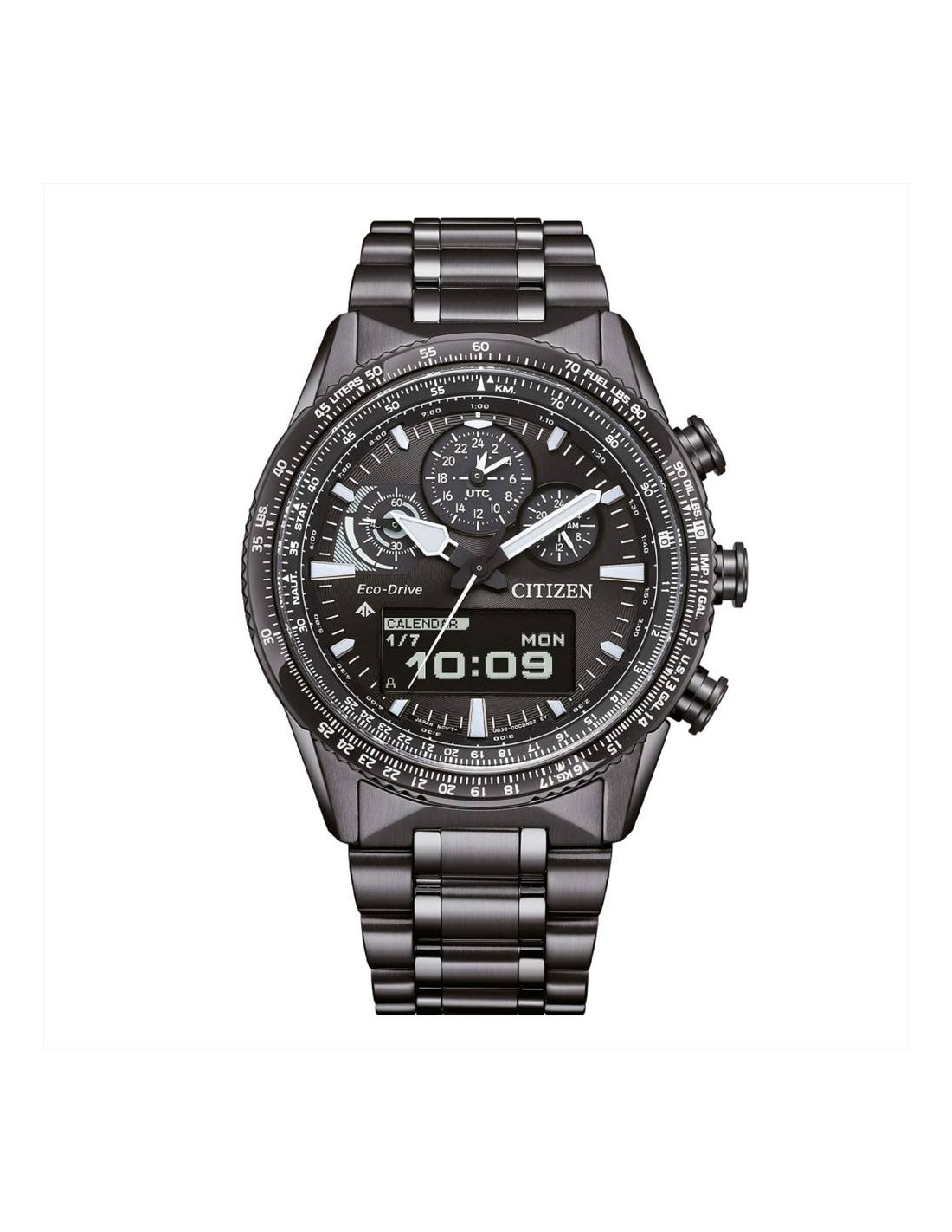 Orologio Citizen Promaster Skyhawk U830, uomo. Cassa in acciaio con trattamento PVD nero e dotata di regolo calcolatore aeronautico da 43 mm. Quadrante nero combinato analogico-digitale include funzioni professionali come world time, cronografo a 1/100 di secondo fino a 24 ore, timer, allarme e calendario perpetuo. Ghiera girevole. Vetro zaffiro. Movimento Eco-Drive a carica luce con riserva di carica fino a 3 anni e indicatore energia generata. Cinturino in acciaio con trattamento PVD nero. Impermeabilità di 20 atm.
