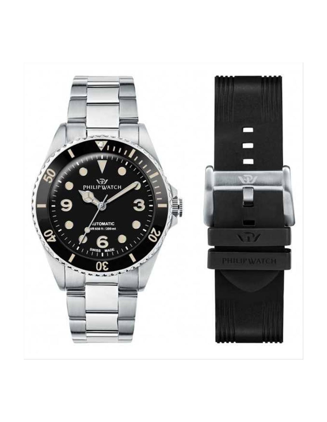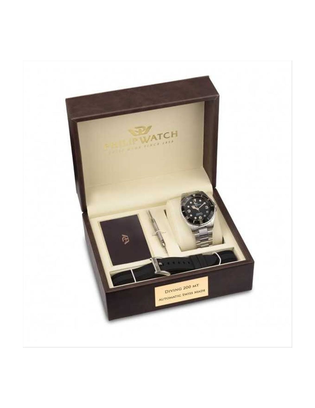 Orologio Philip Watch Caribe Diving, solo tempo uomo. Cassa rotonda in acciaio inox dal diametro di 42 mm. Lunetta nera girevole con inserto in ceramica nera con scala dei minuti. Fondello e corona a vite.