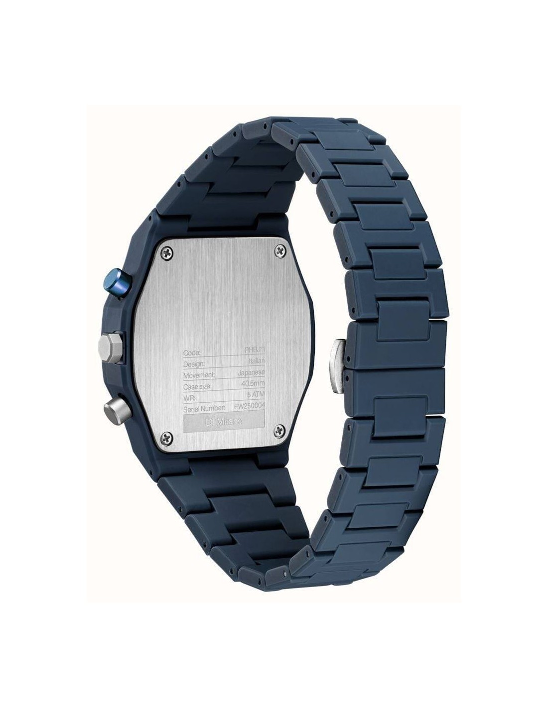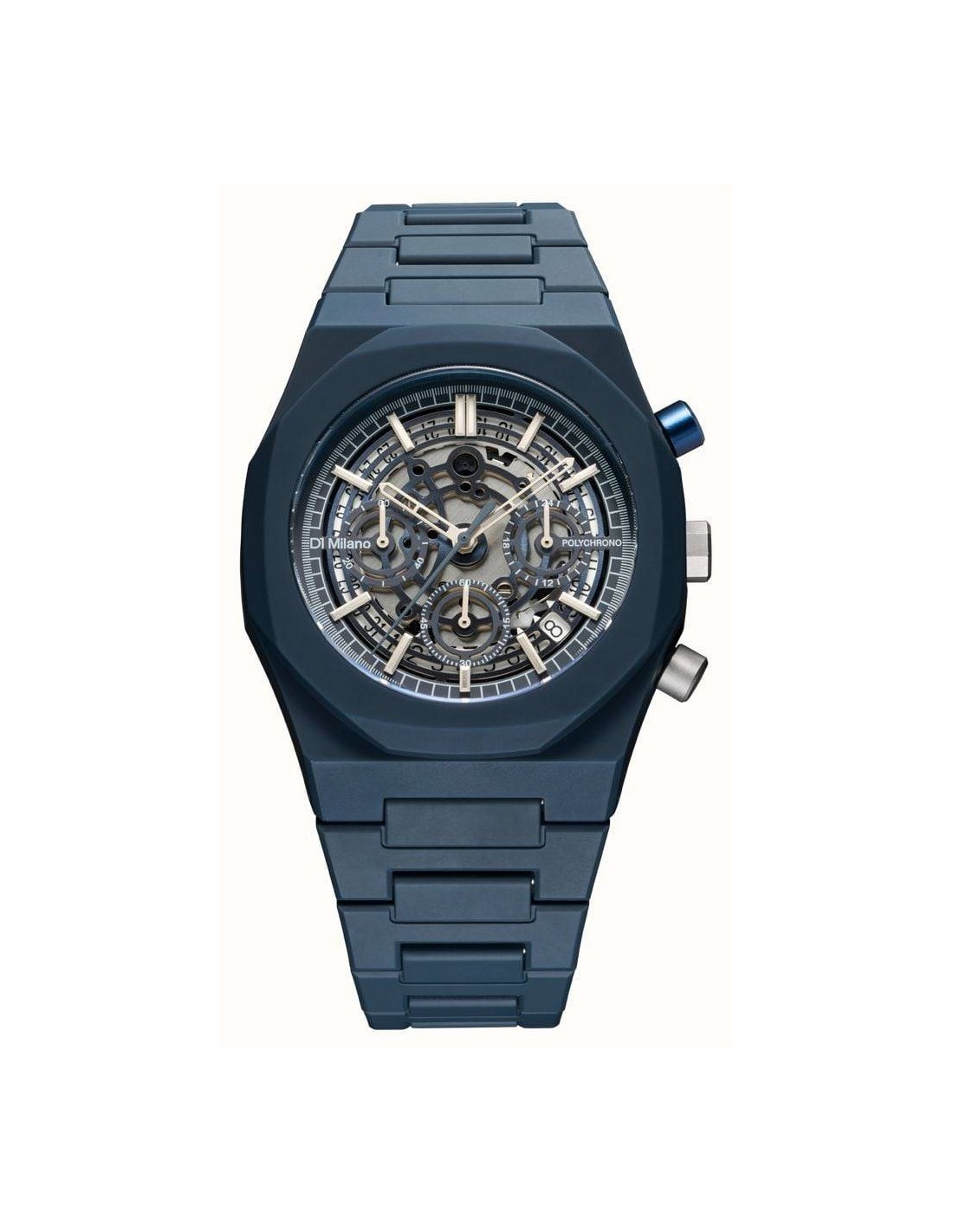 Orologio D1Milano Model B, solo tempo. Cassa in policarbonato blu con finitura soft-touch di dimensioni 40,5 mm, quadrante scheletrato che rivela con discrezione il movimento sottostante, con indici e lancette silver. Lunetta in policarbonato blu e fondello in acciaio. Datario a ore 4. Vetro minerale antiriflesso. Movimento al quarzo calibro TMI VD53C. Cinturino in policarbonato blu con finitura soft-touch. Impermeabilità di 5 atm. Il policarbonato è un materiale plastico molto leggero e resistente a graffi e urti. Orologio semplice ma innovativo nel design, con un unico colore per una scelta unica e per una personalità decisa.