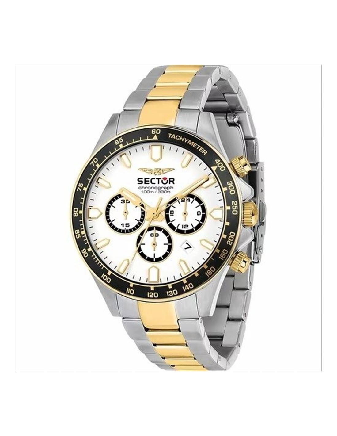 Orologio Sector 230, cronografo uomo. Cassa in acciaio da 43 mm, quadrante bianco con indici e lancette dorate luminescenti, datario alle ore 4. Lunetta tachimetrica nera. Movimento al quarzo e vetro minerale. Cinturino in acciaio bicolore silver e dorato. Impermeabilità di 10 atm.