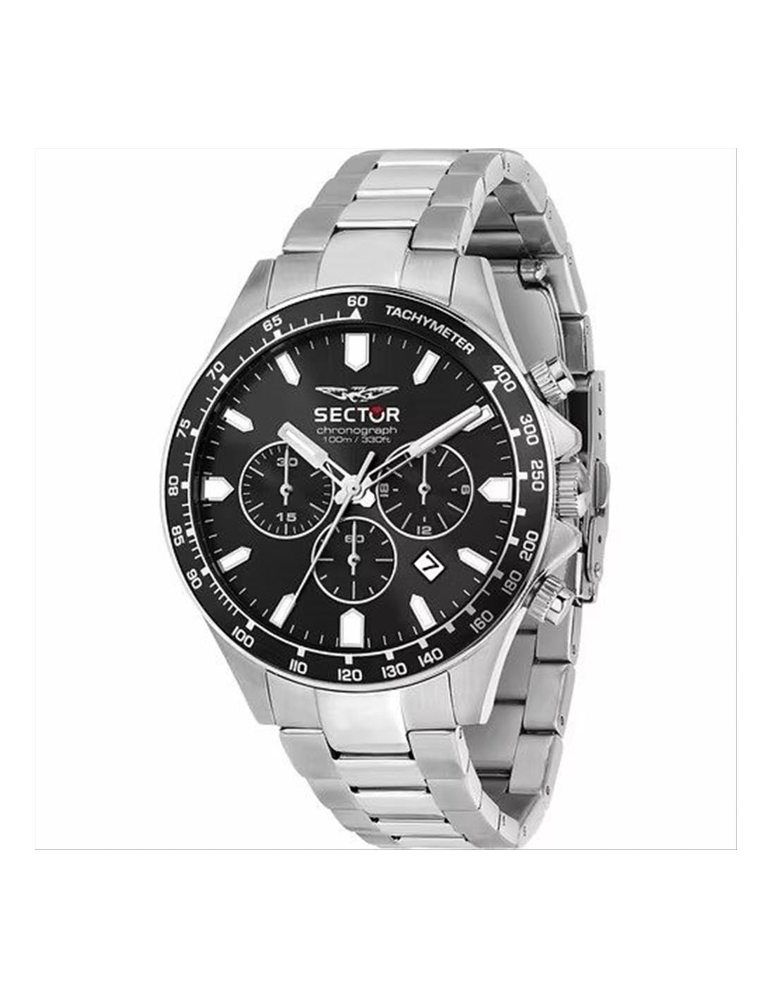 Orologio Sector 230, cronografo uomo. Cassa in acciaio da 44 mm, quadrante nero con indici e lancette luminescenti. Datario alle ore 4. Lunetta tachimentrica nera. Movimento al quarzo e vetro minerale. Cinturino in acciaio. Impermeabilità di 10 atm.