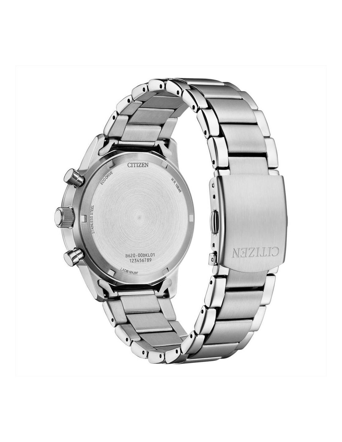 Orologio Citizen Aviator Crono, cronografo uomo. Cassa in acciaio con fondo serrato a vite da 42 mm, quadrante verde con indici e lancette luminescenti, datario a ore 4. Vetro minerale e movimento eco drive a carica luce con riserva di carica di 270 giorni. Cinturino in acciaio e impermeabilità di 10 atm.