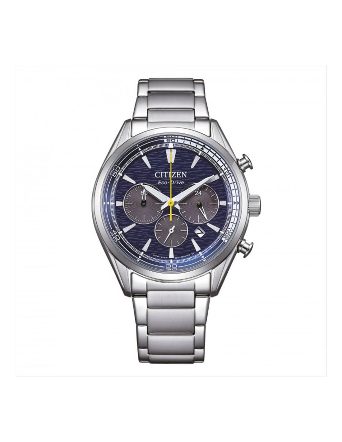 Orologio Citizen, cronografo uomo. Cassa in acciaio con fondo serrato a vite da 42 mm, quadrante blu con raffinata trama, con indici e lancette luminescenti, contatori del crono grigi, e datario a ore 4. Vetro minerale e movimento eco drive a carica luce con riserva di carica di 270 giorni. Cinturino in acciaio e impermeabilità di 10 atm.