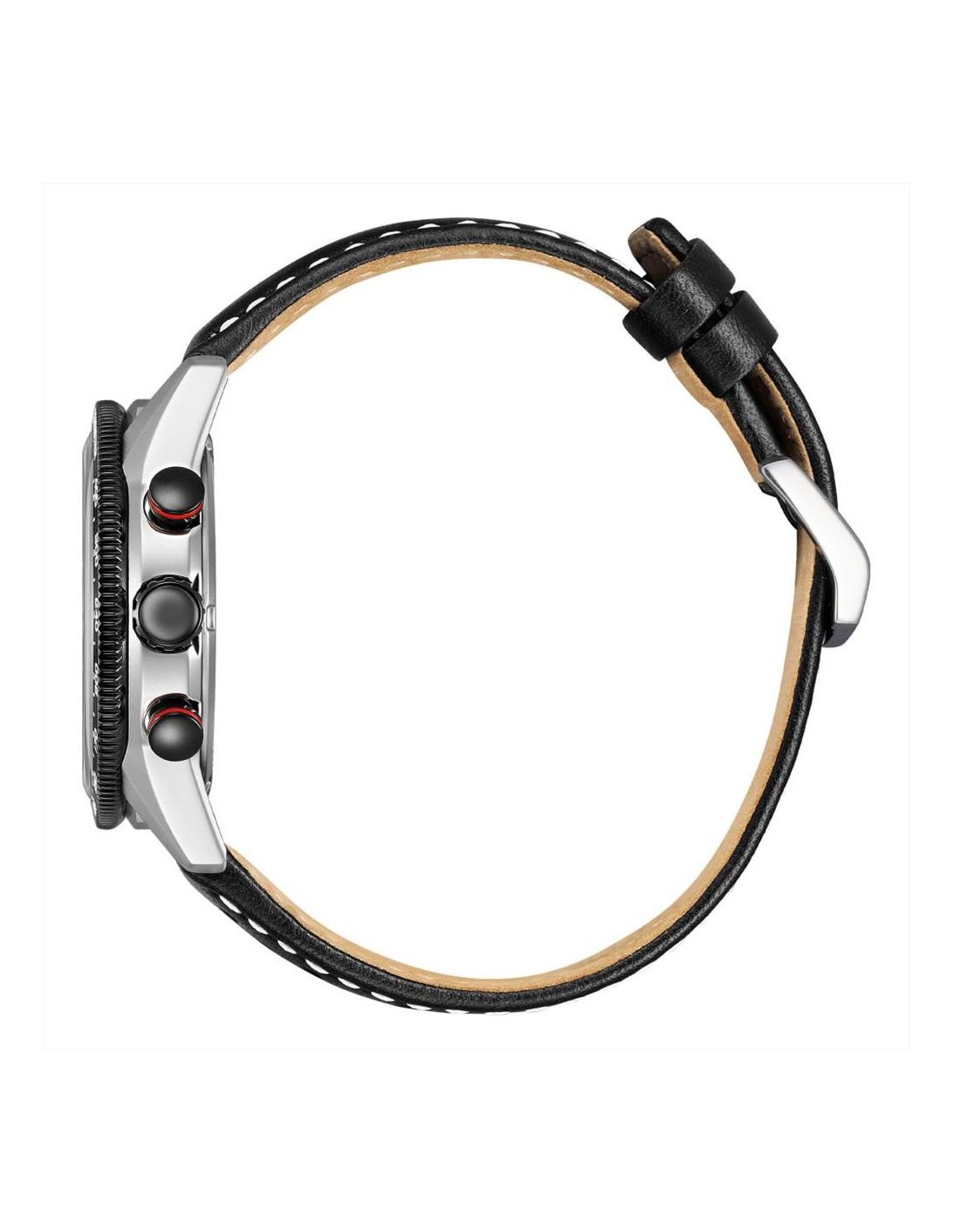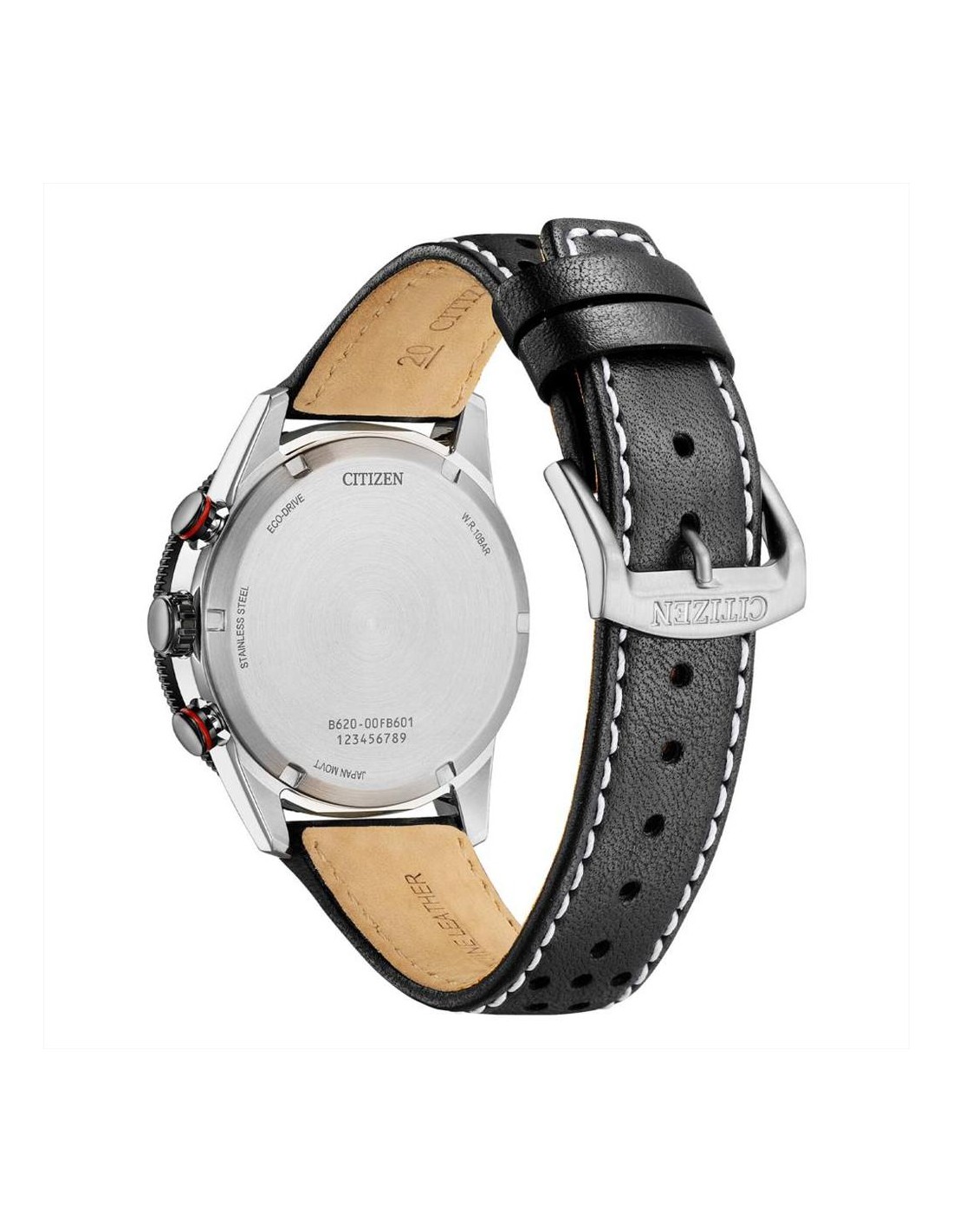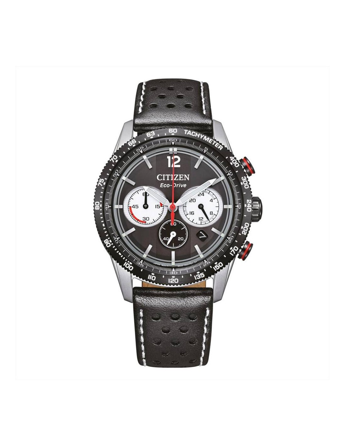 Orologio Citizen Racing Crono, cronografo uomo. Cassa in acciaio con Orologio Citizen Racing Crono, cronografo uomo. Cassa in acciaio con fondo serrato a vite da 39 mm, quadrante nero con indici e lancette luminescenti, e dettagli rossi. Datario a ore 4. Lunetta in acciaio trattato IP color nero. Vetro minerale curvato e movimento eco drive a carica luce con riserva di carica di 270 giorni. Cinturino in pelle nero con chiusura di sicurezza e impermeabilità di 10 atm.