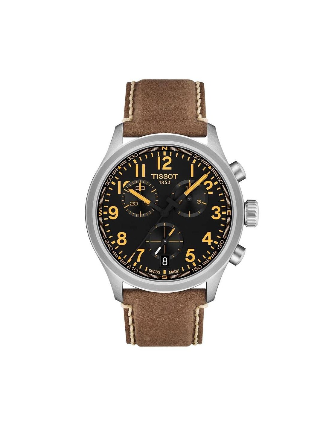 Orologio Tissot L, cronografo uomo, che entra a far parte della famiglia Tissot XL. Cassa in acciaio silver da 42 mm, quadrante nero, lancette e indici con numeri arabi gialli a contrasto. Datario a ore6. Vetro zaffiro antigraffio con trattamento antiriflesso, movimento al quarzo G10.212 garantisce precisione e affidabilità. Cinturino in pelle beige con impunture a contrasto. Impermeabilità di 10 atm.