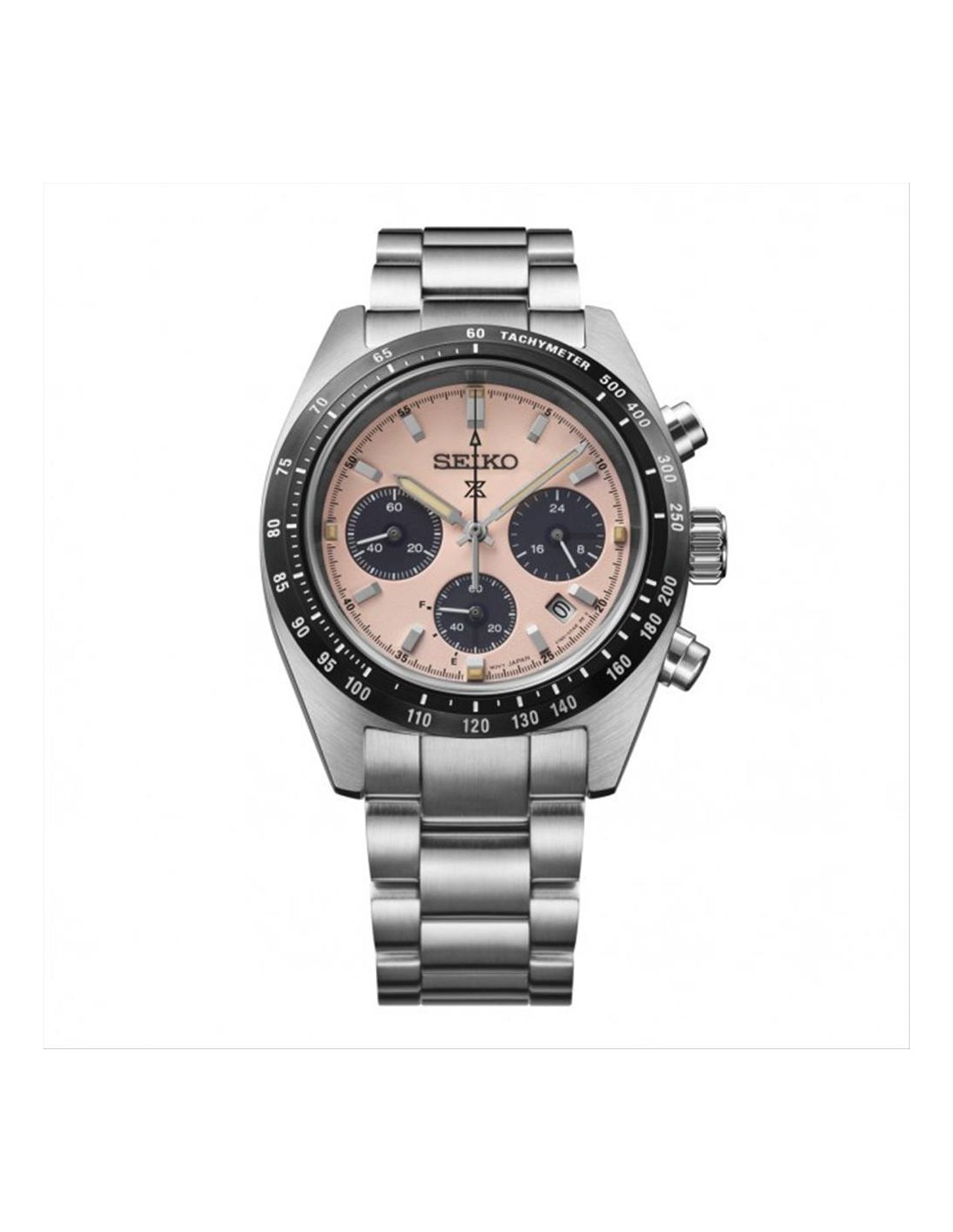Orologio Seiko Prospex Speedtimer Solar, cronografo uomo/ donna. Cassa in acciaio da 39 mm, quadrante di tonalità rosa pallido e dettagli tecnici ispirati al mondo del motorsport con indici silver e lancette luminescenti. Lunetta nera con scala tachimetrica. Movimento al quarzo a carica solare calibro solare V192 con riserva di carica di 6 mesi. Vetro zaffiro curvo con trattamento antiriflesso interno per una visibilità ottimale. Cinturino in acciaio e in dotazione un cinturino di ricambio in pelle beige. Impermeabilità di 10 atm.