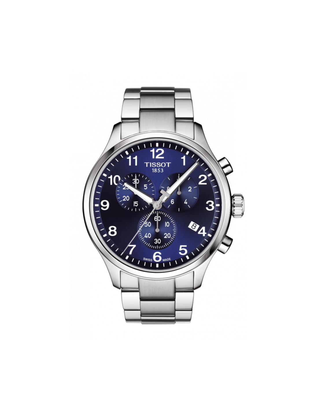 Orologio Tissot Chrono XL, cronografo uomo. Cassa in acciaio silver da 45 mm, quadrante blu con numeri arabi bianchi, lancette luminescenti, vetro zaffiro antigraffio, movimento al quarzo, datario alle ore 4, cinturino in acciaio silver. Impermeabile fino a 10 atm.