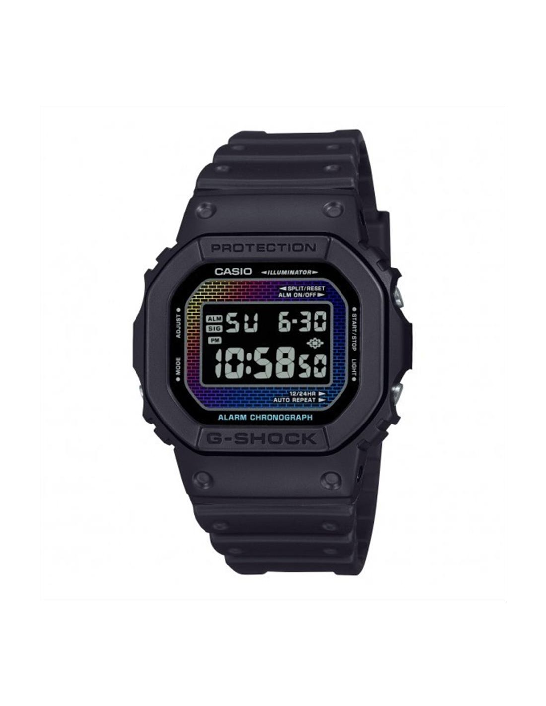 Orologio Casio G-Shock, digitale. Cassa antiurto realizzata in resina nera dalle dimensioni di 48,9 mm x 42,8. Fondello in acciaio inox. Quadrante con sfondo multicolor protetto da un robusto vetro minerale antigraffio. Sul display è possibile visualizzare l'orario in formato 12 o 24 ore, il datario automatico, la sveglia e le funzioni attive. Retroilluminazione del quadrante tramite tasto laterale. Cinturino in resina color nero. Funzioni di cronometro con accuratezza di 1 centesimo di secondo, timer per il conto alla rovescia e possibilità di inserire una sveglia giornaliera. Resistente all'acqua fino a 200 metri di profondità.