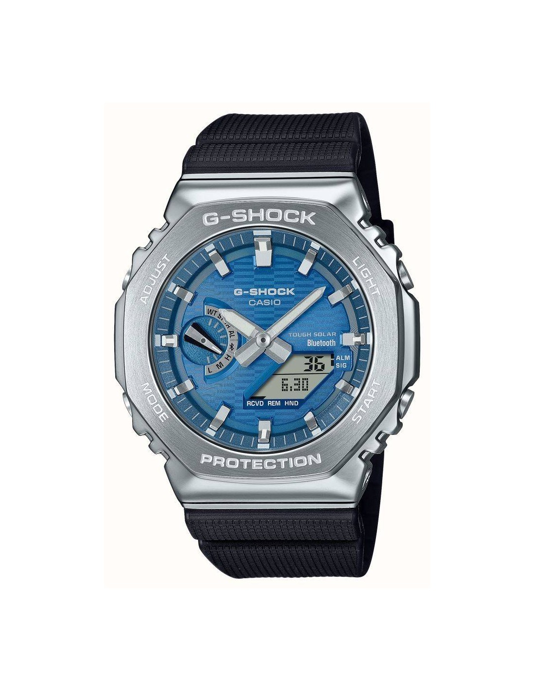 Orologio Casio G-Shock Bluetooth. Funzione di connessione allo smartphone Mobile Link (collegamento wireless tramite Bluetooth) Funzione di connessione all'app: Regolazione orologio automatica, Impostazione semplice dell'orologio, Ora internazionale di circa 300 città, Ora e posizione, Promemoria, Trova telefono. Movimento a energia solare per estensione della durata batteria. Cassa antiurto in resina con cover in acciaio anallergico di dimensioni (A x L x P) 49.3 × 44.4 × 11.9 mm. Quadrante blu con disegno a rettangoli, indici e lancette luminescenti. Vetro minerale. inturino in resina nera a base biologica ecosostenibile. Impermeabilità di 20 atm. Funzioni: Cronometro, Timer, Luce, Calendario, Funzione di risparmio energetico, Disattivazione del volume, Visualizzazione/avviso dello stato della batteria, Cronometraggio della corsa, Promemoria sonoro /Segnale orario.