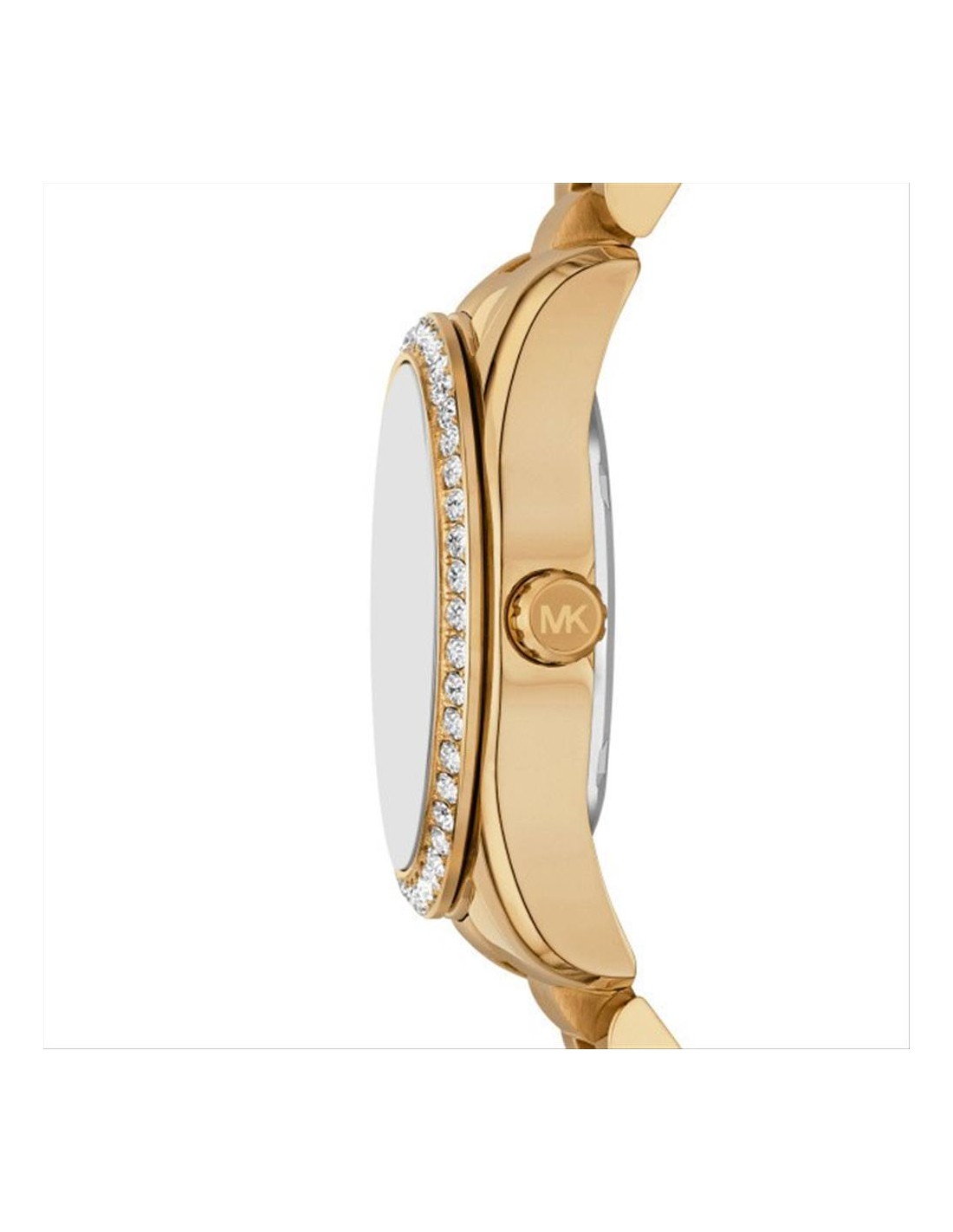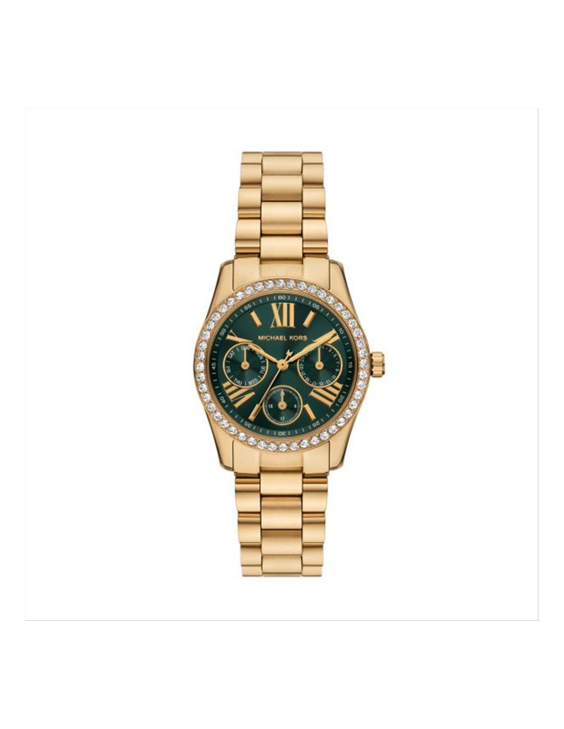 Orologio Michael Kors Lexington, multifunzione donna. Cassa in acciaio dorato da 34 mm con lunetta impreziosita cristalli, quadrante verde con indici e lancette dorate. Movimento al quarzo, vetro minerale e cinturino in acciaio dorato. Impermeabilità di 5 atm.