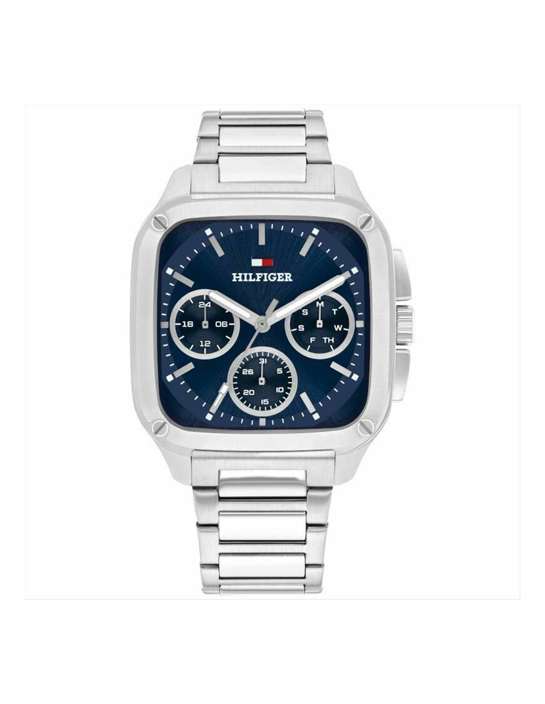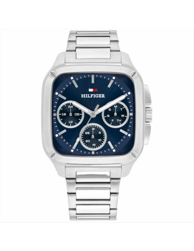 Orologio Tommy Hilfiger Herald, multifunzione uomo. Cassa quadrata in acciaio con un diametro di 37x39 mm. Quadrante blu con indici silver e lancette luminescenti. Vetro minerale e movimento al quarzo. Cinturino in acciaio silver. Impermeabilità di 5 atm.