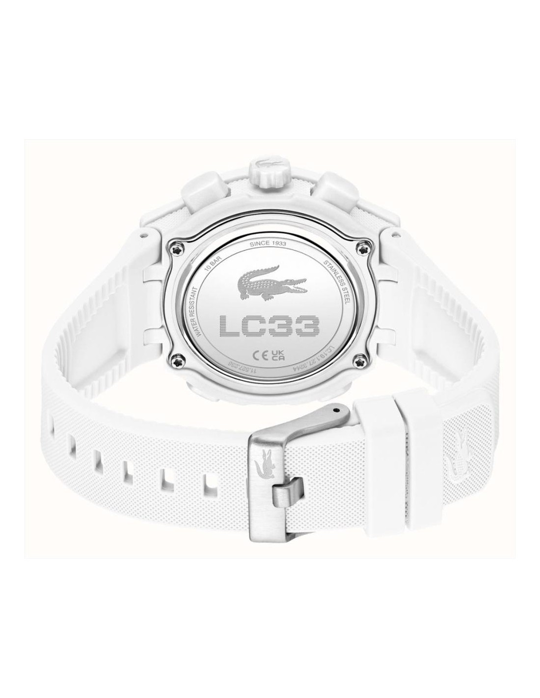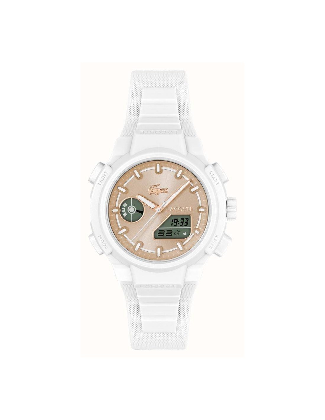 Orologio Lacoste, multifunzione donna. Cassa da 40 mm in resina color bianco con doppio movimento analogico-digitale, quadrante color oro rosa con indici e lancette luminescenti, quadrante secondario per i giorni feriali a ore 9 e un quadrante secondario digitale tra le ore 3 e le ore 6. Movimento al quarzo e vetro minerale. Cinturino in silicone color bianco. Impermeabilità di 10 atm. Funzione: cronografo, sveglia e data.