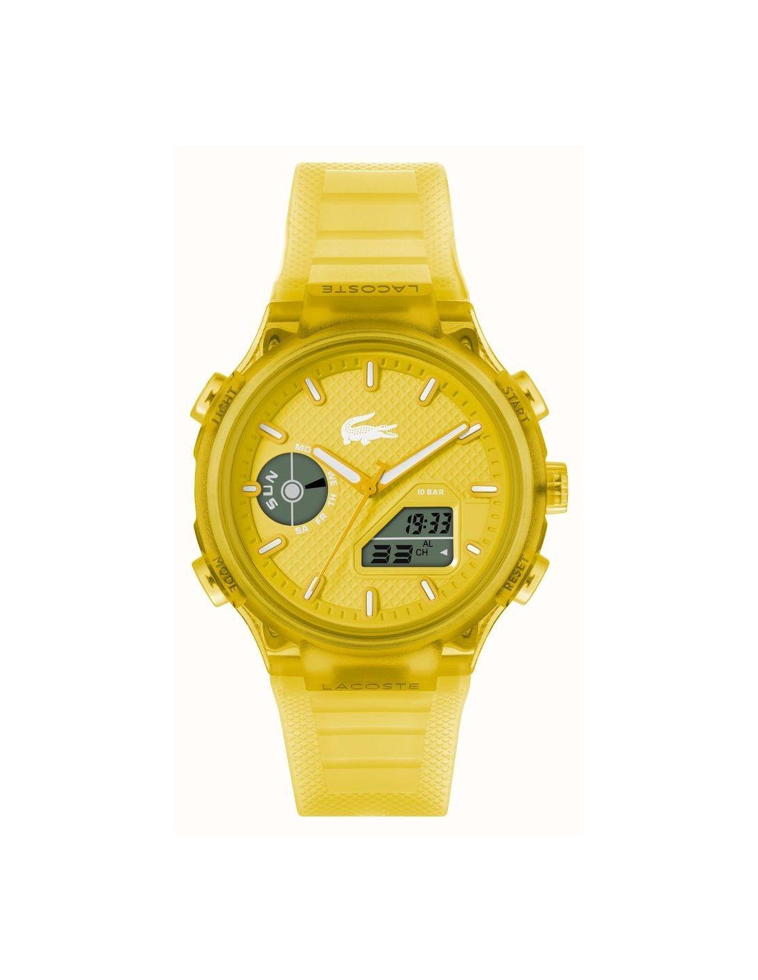Orologio Lacoste, multifunzione uomo. Cassa da 45 mm in resina gialla trasparente con doppio movimento analogico-digitale, quadrante giallo testurizzato con indici e lancette luminescenti, quadrante secondario per i giorni feriali a ore 9 e un quadrante secondario digitale tra le ore 3 e le ore 6. Movimento al quarzo e vetro minerale. Cinturino in silicone giallo trasparente. Impermeabilità di 10 atm. Funzione: cronografo, sveglia e data.