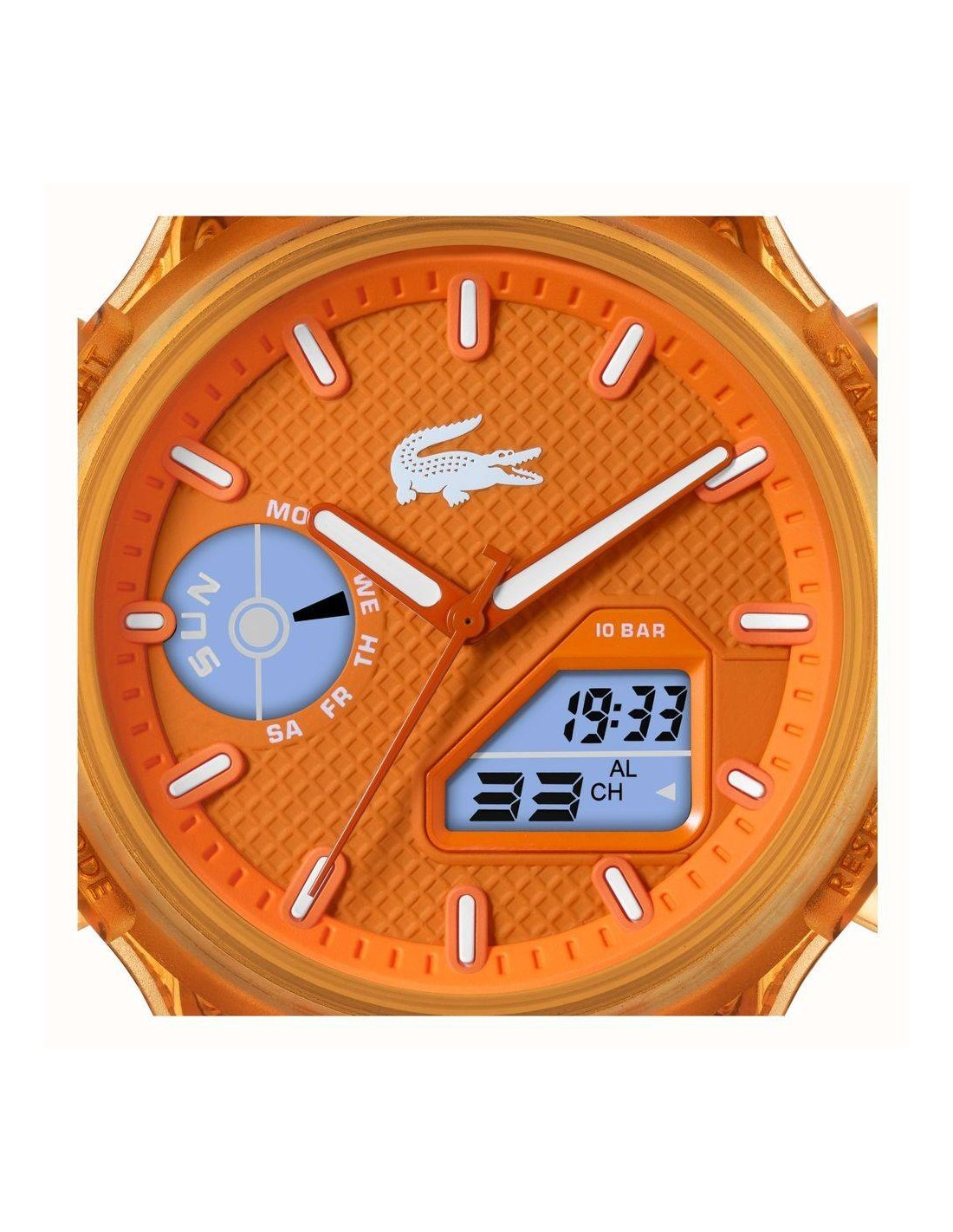 Orologio Lacoste, multifunzione uomo. Cassa da 45 mm in silicone arancione trasparente con doppio movimento analogico-digitale, quadrante arancione testurizzato con indici e lancette luminescenti, quadrante secondario per i giorni feriali a ore 9 e un quadrante secondario digitale tra le ore 3 e le ore 6. Movimento al quarzo e vetro minerale. Cinturino in silicone arancione trasparente. Impermeabilità di 10 atm. Funzione: cronografo, sveglia e data.